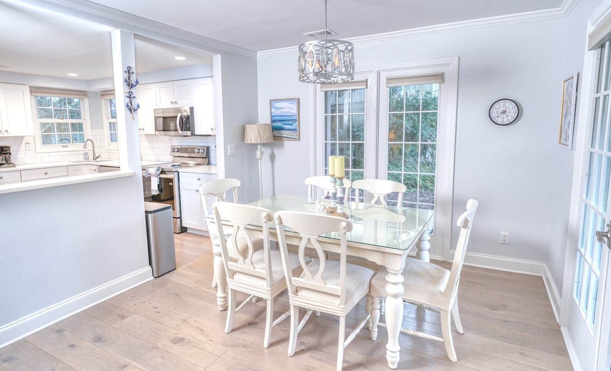 Acogedor, moderno y diseñado con carácter, este apartamento de 2 habitaciones y 2 baños recientemente remodelado es el más cercano a la playa, una joya escondida de Hilton Head, con vistas a la laguna y al estrecho. Cama tamaño king en el dormitorio principal, camas individuales en la habitación de los niños: solárium cerrado, 3 piscinas, jacuzzi, tenis. Cocina totalmente abastecida con una barra cafetera, favorita de los huéspedes, que se reabastece con productos frescos en cada estancia. Lavandería en el alojamiento, televisores de pantalla grande en todas las habitaciones, todo el equipo de playa que necesite (carrito, sillas, tablas, juguetes y mucho más), Internet de 400 MB, ¡sin tarifa de limpieza!