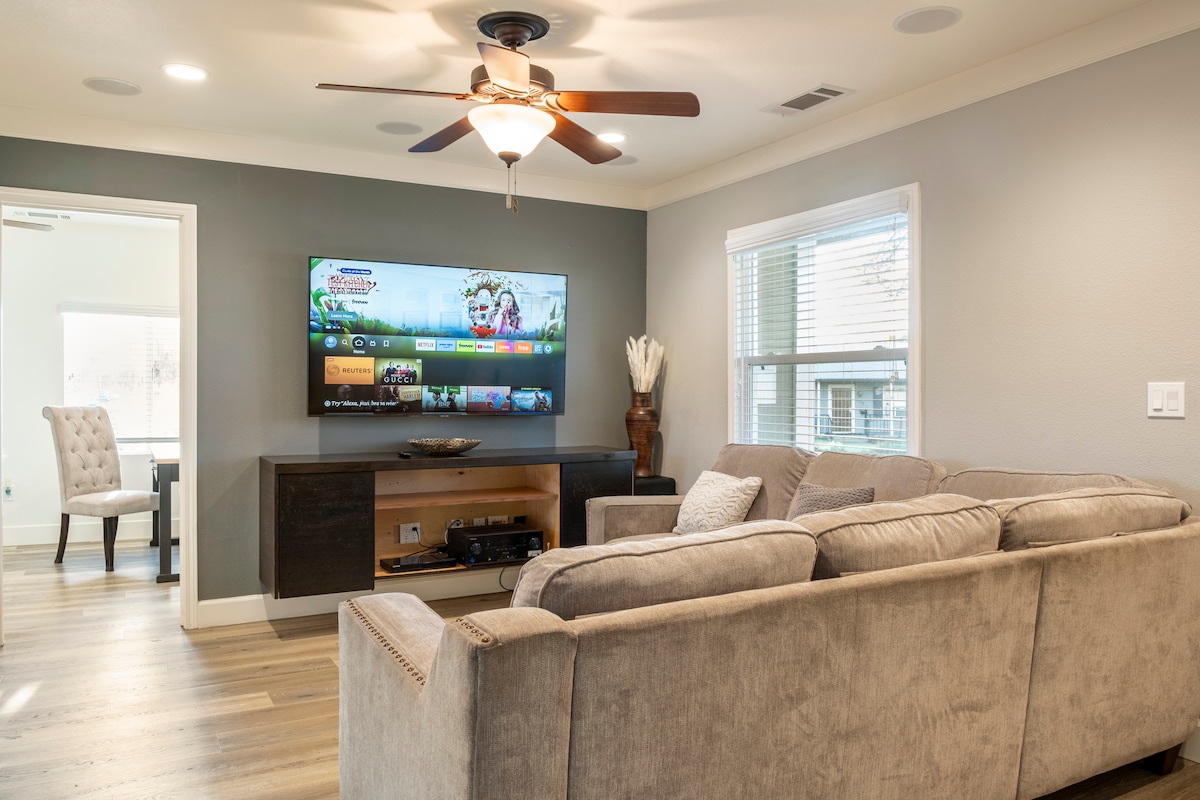 Stay at this unique and family-friendly place 3 bedroom single story home. king bed at bedrm#1 , Queen bed at bedrm#2 and two twins in bedrm#3 & one airbed. Smart tv’s at family & owner room. Fully stocked & functional kitchen & laundry. Beautiful custom walking shower with rain shower & seat. Relaxing backyard fully landscape. Lots of parking it can fit RV. 5 min walk to fair ground events, easy access to freeway in & out. Five min away from all most popular eating places, No parties