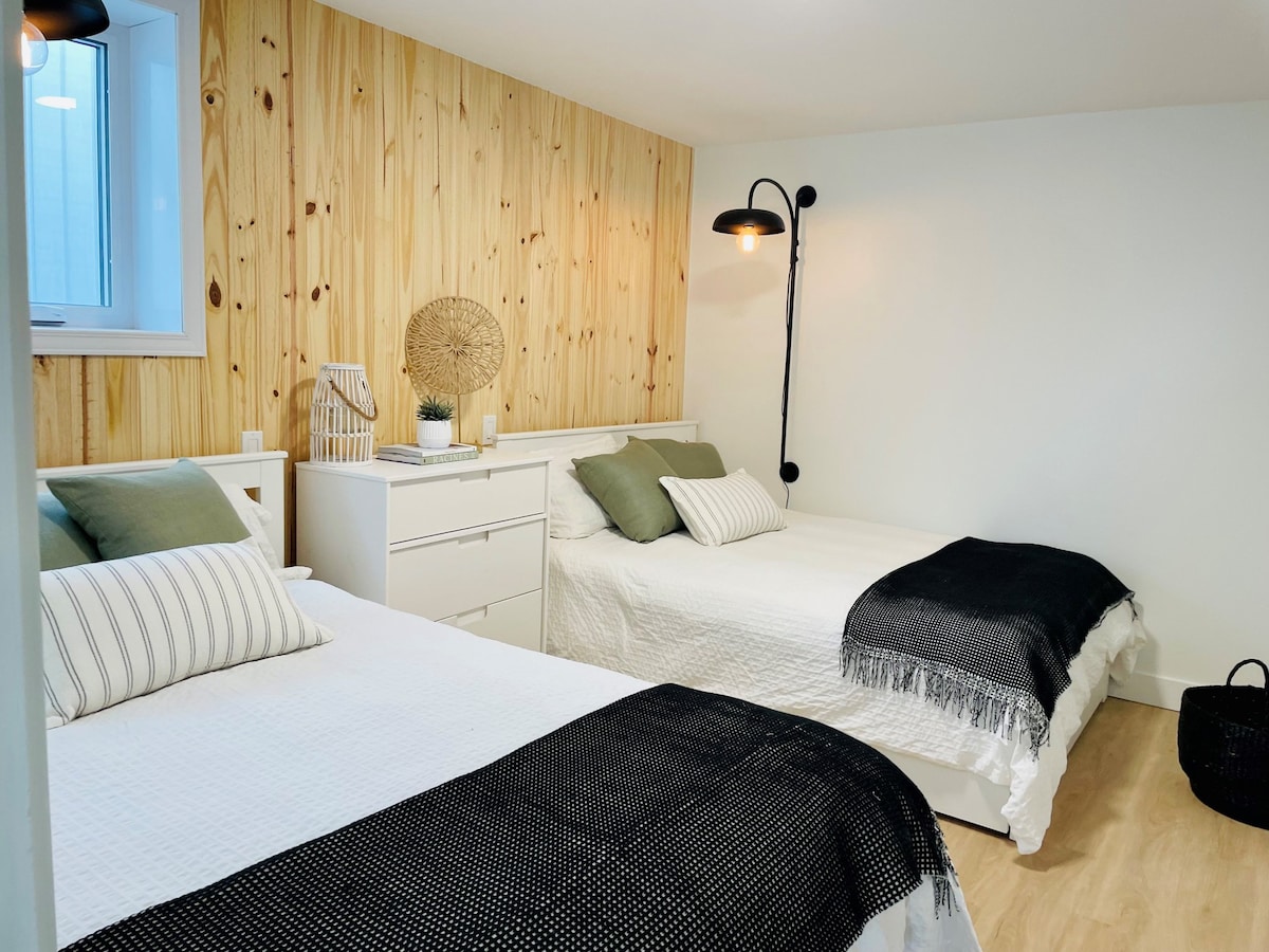 Superhost +de 7 ans *dimanche à jeudi PRIX RÉDUITS Rénové en 2024. Acces direct pente familiale niveau montes pentes. Auto à la porte /Air climatisé thermopompe, 2 chambres + divan lit au salon, cuisine complète, douche-bain. WIFI bureau, TV câble, foyer au gaz, céramique chauffante, lit bébé, animaux acceptés sur demande ($), grand hall entrée, à 10 minutes du village/activités villages relais. SPA à 5 min ($); maison non fumeur/vapotage (frais$250)