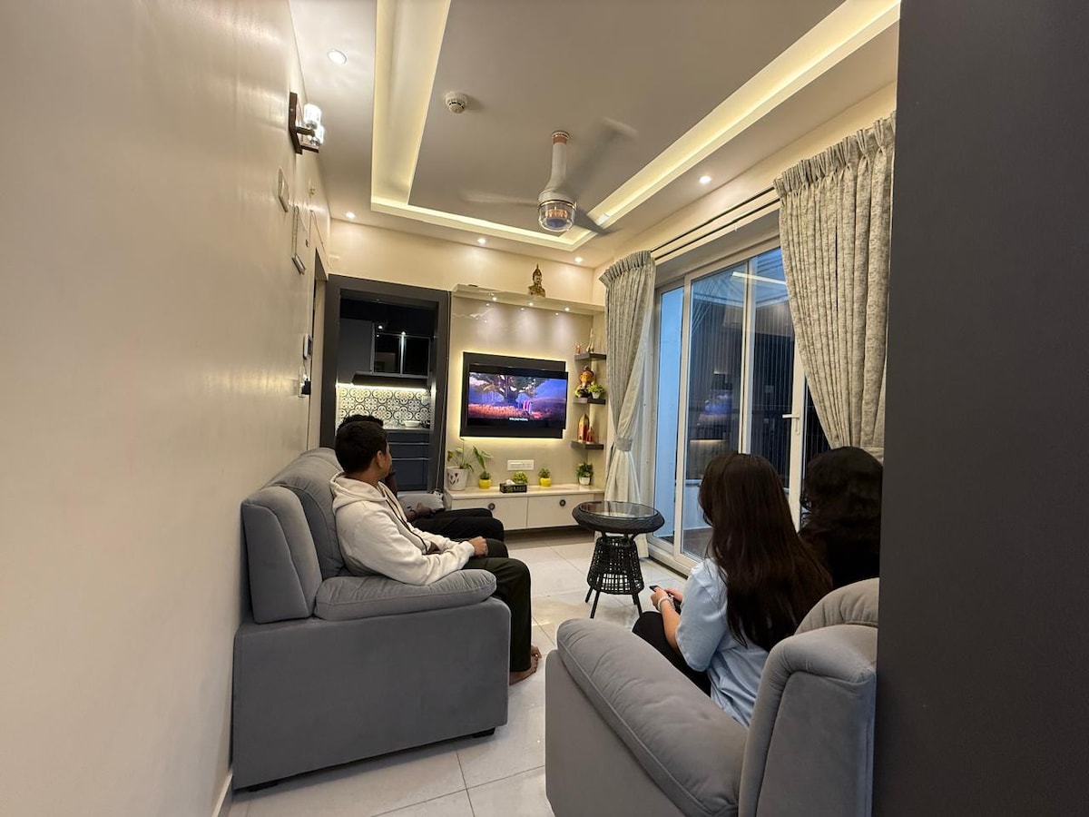 Retiro de niebla plateada | Amplio, acogedor y moderno 2BHK con cocina completa, lavadora y balcón privado. Disfruta de una luminosa sala de estar con sofá cama, cómodas habitaciones con lujosas sábanas y baños elegantes con ducha a ras de suelo. La cocina está equipada para cocinar básicamente. Diseñado cuidadosamente para la comodidad y la comodidad, este alojamiento es perfecto para familias, amigos o lugares de trabajo.