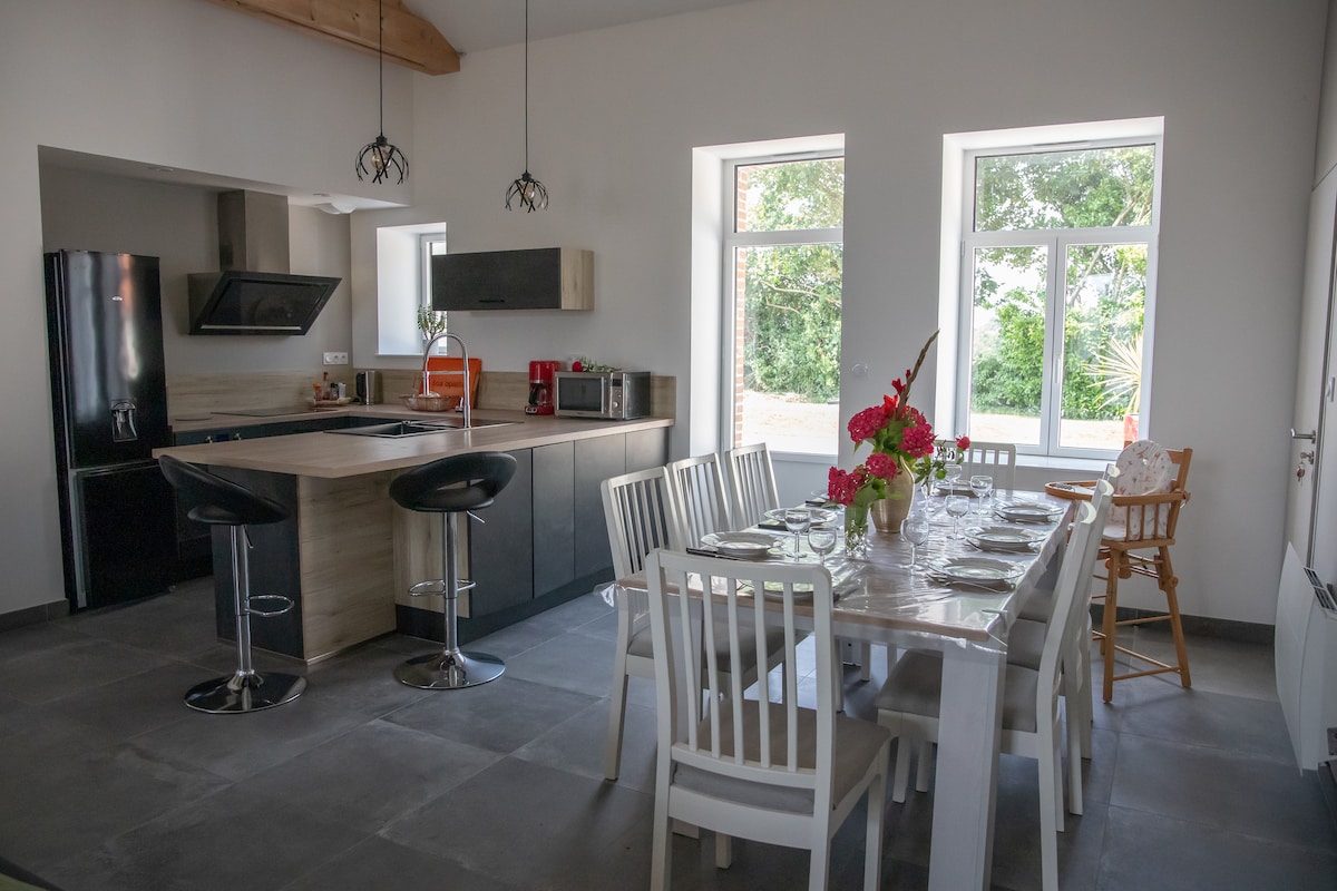 Respeto del protocolo de limpieza reforzada establecido por Air BnB Casa de campo de 130 m2 acondicionada en un antiguo granero distribuido en 2 niveles. Planta baja: sala de estar con zona de cocina y zona de estar. Aseo separado. 1 dormitorio con baño privado (+ lavadora). Planta superior: 1 dormitorio con baño privado + cama para 2 niños. WC separado. Exterior: patio inglés de 93 m2 con muebles de jardín + barbacoa + sombrilla + tumbonas. Espacio verde no vallado accesible desde el lado de la casa de campo y desde el lado de la casa.