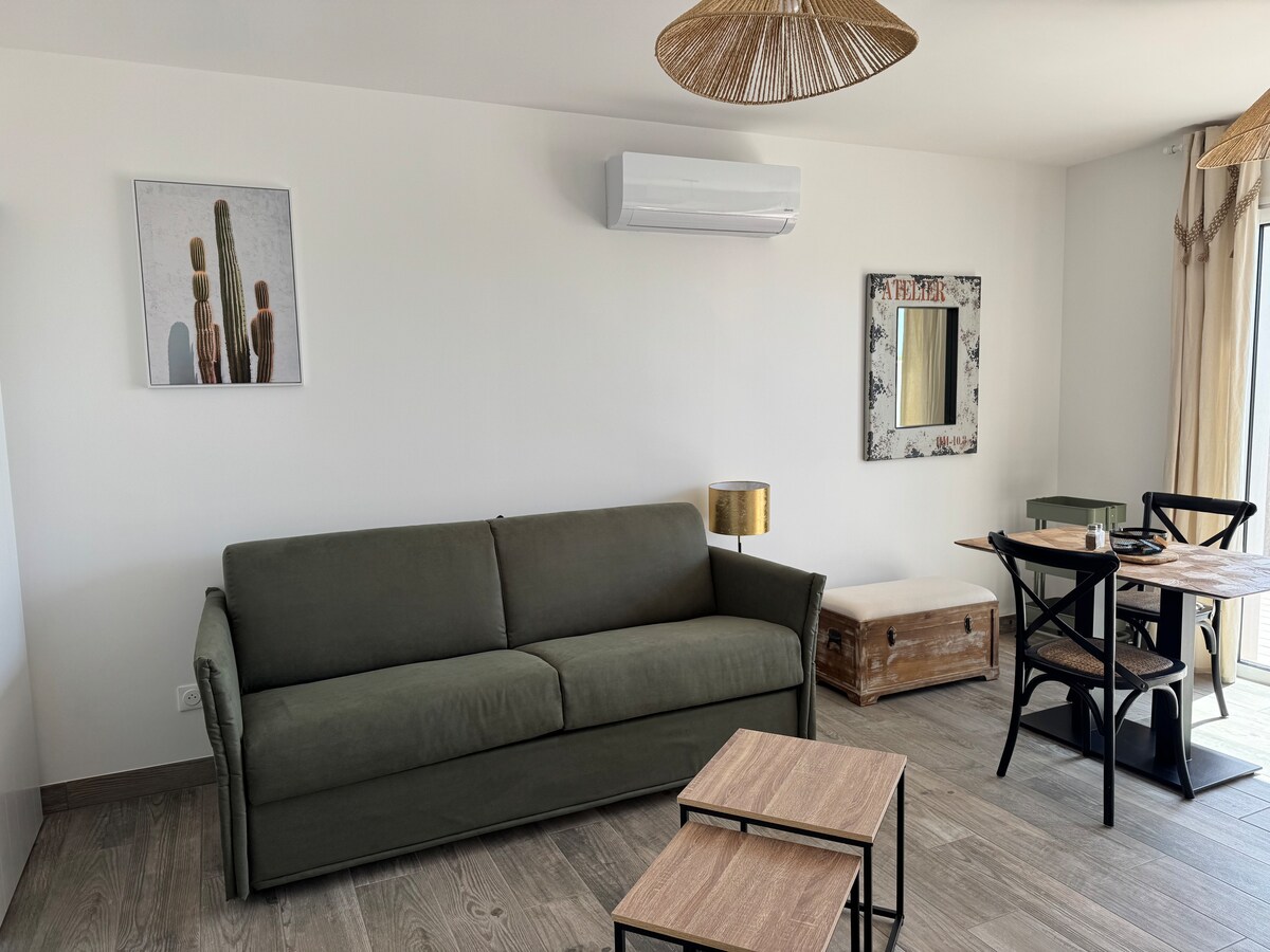 Relájese en este alojamiento tranquilo y elegante: ~ Apartamento tipo T2, situado en el corazón de la pequeña ciudad de Dompierre-sur-Mer (a pocos minutos de La Rochelle/Isla de Ré en coche) y cerca de los comerciantes a pie (panadería, farmacia, carnicería, mercado…) ~ Consta de una gran sala de estar (salón/cocina/comedor), un cómodo dormitorio con cuarto de ducha abierto, un aseo aparte y una entrada independiente. ~ Seguimos disponibles para ayudarle a preparar su estancia