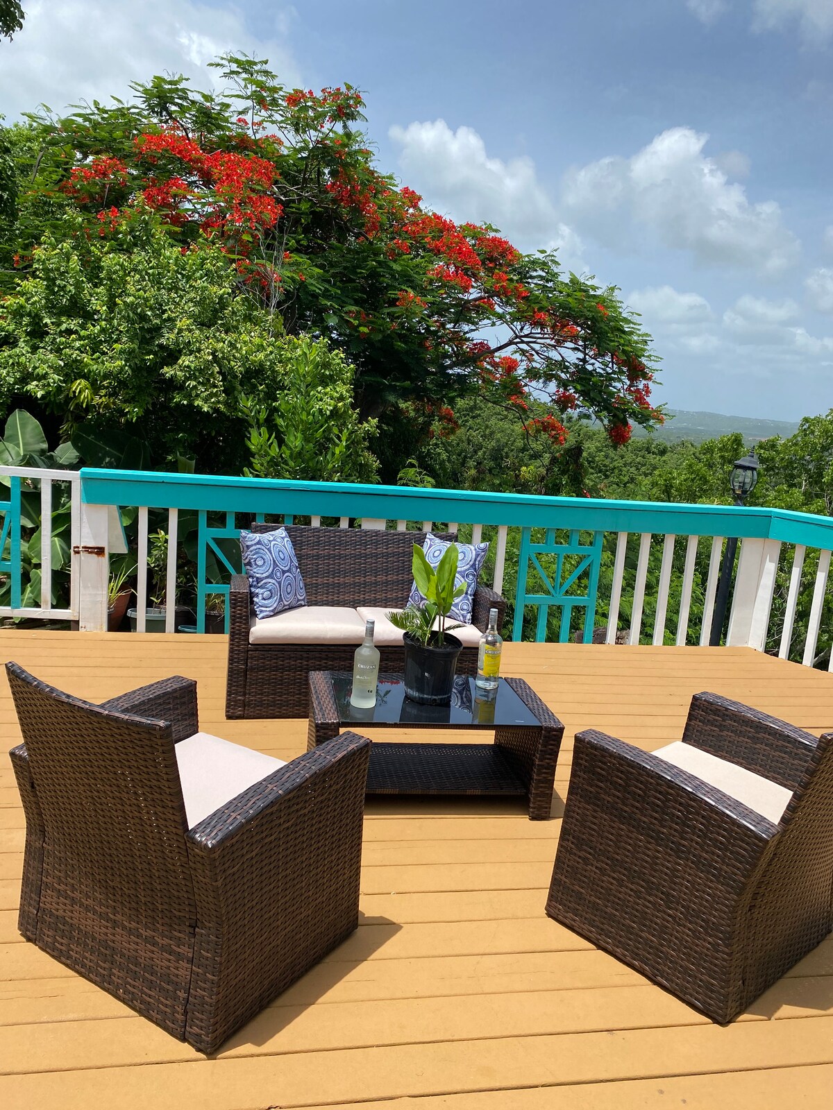 La suite de invitados está unida a una casa privada que se encuentra en la cima de una colina con vistas al mar. Entrada privada con cama tamaño queen, aire acondicionado, cocina, sistema de alarma de seguridad, lavadora y secadora, balcón envolvente para comer al aire libre y estacionamiento. Puedes ver el aterrizaje y despegue del hidroavión desde el puerto de Christiansted. Cerca de la ciudad de Christiansted con buena comida, tienda de comestibles, playa y actividades sociales.