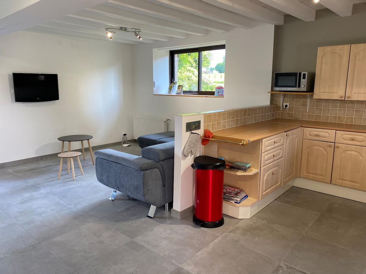 ¡A medio camino entre el Monte St Michel y los castillos del Loira! En una ruta de senderismo, se alojará cómodamente en la tranquilidad del campo y con total independencia. Tendrá a su disposición una bonita sala de estar con 1 sofá y 1 mesa, 2 dormitorios y un baño. Dispondrá de una terraza privada frente a los pastos. Solo, en pareja, con sus hijos o un par de amigos, estaremos encantados de recibirle y ofrecerle un desayuno con nuestros productos caseros.