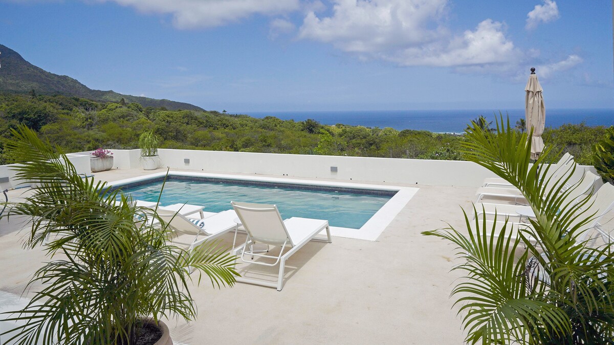 Relájate con toda la familia en esta tranquila casa tropical.... cocina totalmente equipada, sábanas nuevas, áreas de estar bien equipadas, TV inteligente, wifi, hermosa piscina y vistas al monte. Nevis y el océano.