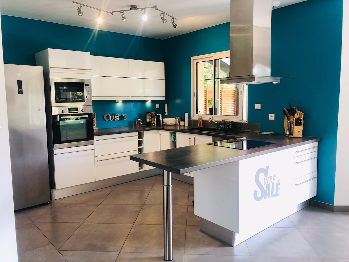 Nido familiar de estilo mediterráneo, ubicado en el corazón de los viñedos entre el estuario de la Gironda y el océano (a 20 minutos). Este insólito lugar rodeado de luz es un punto de partida ideal para recorrer el Médoc. De este modo, será fácil disfrutar de los viñedos, las playas vírgenes de los alrededores y las olas para los surfistas que buscan tranquilidad. La casa se presta a la relajación con su piscina y su ambiente de «slow life».