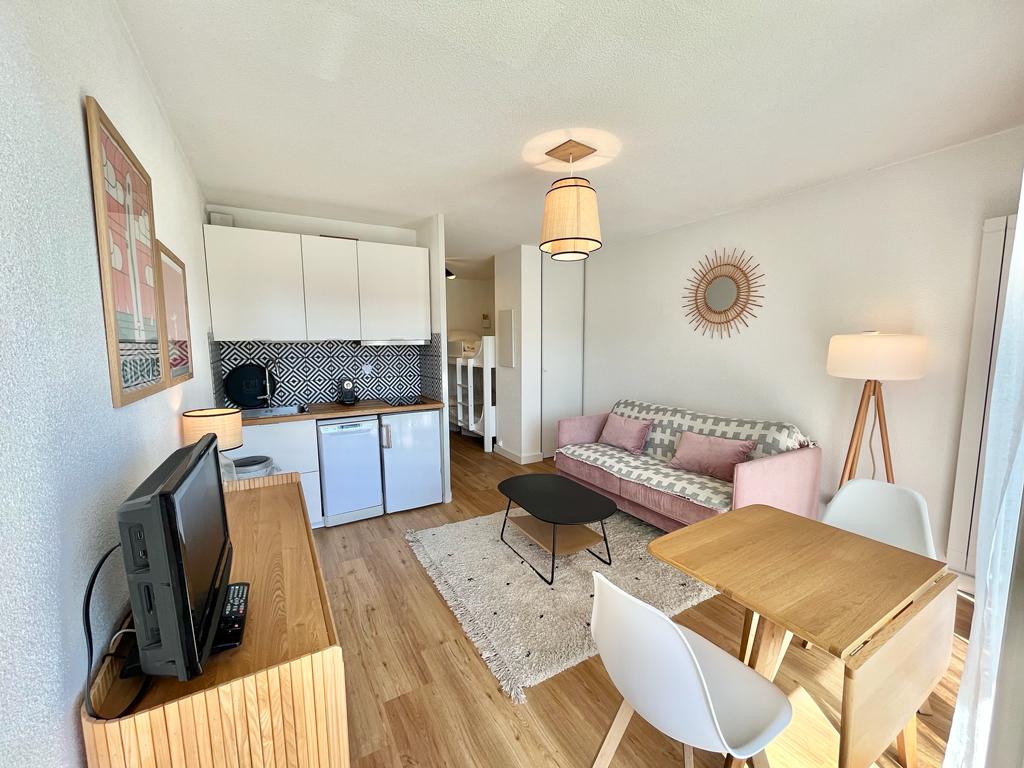 Bonito apartamento familiar de 40m2, totalmente reformado, luminoso y tranquilo, en la 1ª planta en la residencia del golf. Dos terrazas protegidas, una de ellas con vistas a la piscina (climatizada del 5 de abril al 3 de noviembre). El apartamento incluye: - una sala de estar (con un sofá cama, 2 plazas) y una cocina abierta, - un dormitorio con 1 cama de matrimonio, - una habitación con 2 camas individuales superpuestas, - un baño con una bañera, - inodoros separados, - un espacio de estacionamiento privado en el sótano.