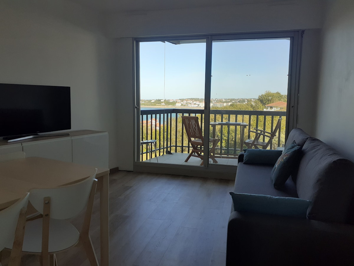 bel appartement T2 entièrement rénové en rez de chaussé comprenant 1 chambre, salon avec 1 canapé convertible,cuisine,salle de bain,terrasse, jardin et parking privé. situé dans une belle résidence avec conciergerie et piscine sur les hauteurs de bordagain avec une vue imprenable sur la baie de socoa- saint jean de luz coté piscine. résidence très calme proche de tout commerce, proche de la plage de socoa et à 5 minutes de saint jean de luz.un parc arboré complète la résidence.