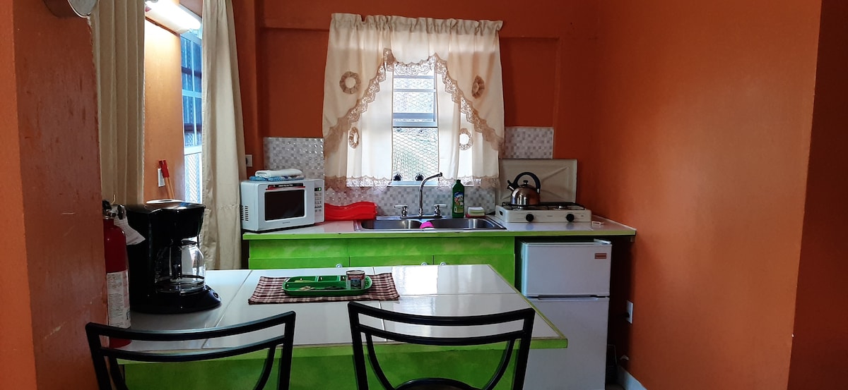 Welcome to our spacious and inviting fully Air-Conditioned studio apartment! 🏝️ Indulge in comfort with a plush Queen-size bed, cozy 2-seater sofa, and dining table for two. 🛏️Whip up delicious meals in the fully equipped kitchen, complete with a full-size stove/oven, fridge, toaster, and kettle. 🍳 Refresh in the spacious shower of the modern bathroom. 🚿 Outside - soak in stunning sunsets from the tiled patio overlooking lush gardens and ocean views. 🌅