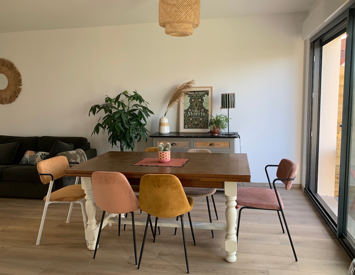 Relájese en este alojamiento equipado con buen gusto, tranquilo y elegante. Gran sala de estar con cocina abierta totalmente equipada 2 hermosas habitaciones con vestidor (ropa de cama nueva de 160 cm con ropa de cama incluida) ducha italiana Aseos separados Terraza privada con muebles de jardín y parrilla Aparcamiento privado cerrado y garaje para moto en las cercanías: Comercios a 5 minutos en coche Parque de atracciones ( Bagatelle, Laby'parc ) Playa de Le Touquet a 10 minutos en coche Pequeños extras: Wifi Equipamiento para bebés