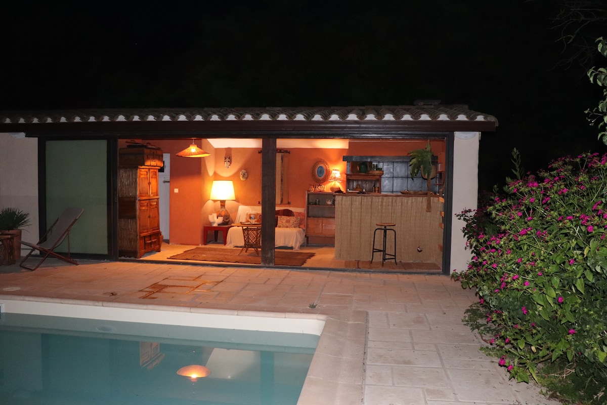¡Te damos la bienvenida a nuestro oasis privado para 1 o 2 personas en el corazón de la roquette! Disfruta de la piscina de agua salada climatizada rodeada de plantas tropicales. El espacio te ofrecerá un remanso de sombra y tranquilidad. Desayuna, toma un aperitivo o cocina junto a la piscina en la cocina del patio al aire libre. El dormitorio tiene aire acondicionado y está equipado con ropa de cama de lujo de calidad hotelera y sábanas orgánicas, para garantizar que tu estancia sea relajante y memorable.