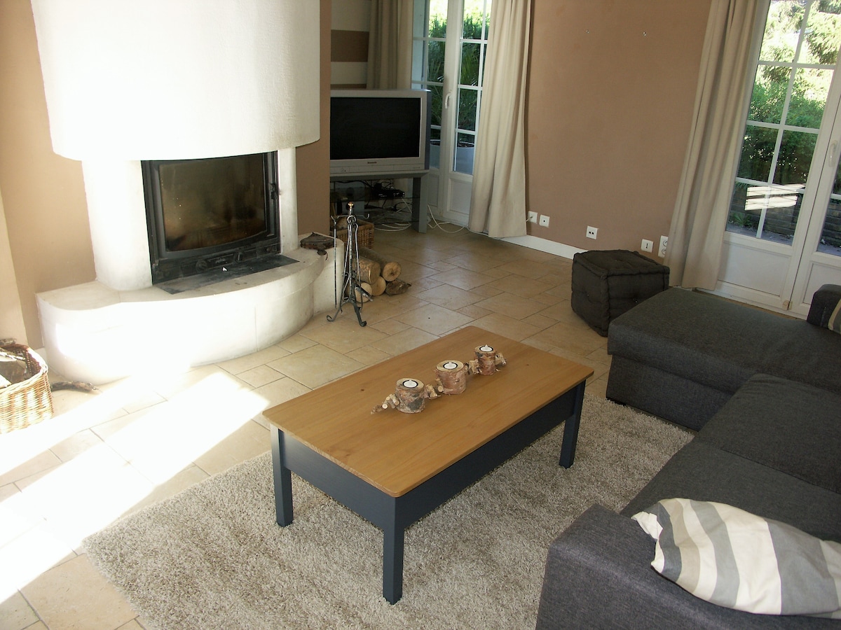 Casa tranquila al final de un callejón sin salida bordeado por el bosque. Dispone de aparcamiento privado, cocina totalmente equipada con ventanal con ventanal con vistas a la terraza. Gran mesa en la cocina que está abierta al salón. Habitación principal en la planta baja con ducha a ras de suelo, inodoro separado, 2 salones ( una chimenea y un televisor), 2 dormitorios en la planta superior con una cama de matrimonio y 2 camas individuales. Cada una tiene su baño + aseo para el máximo confort. Jacuzzi y cama elástica
