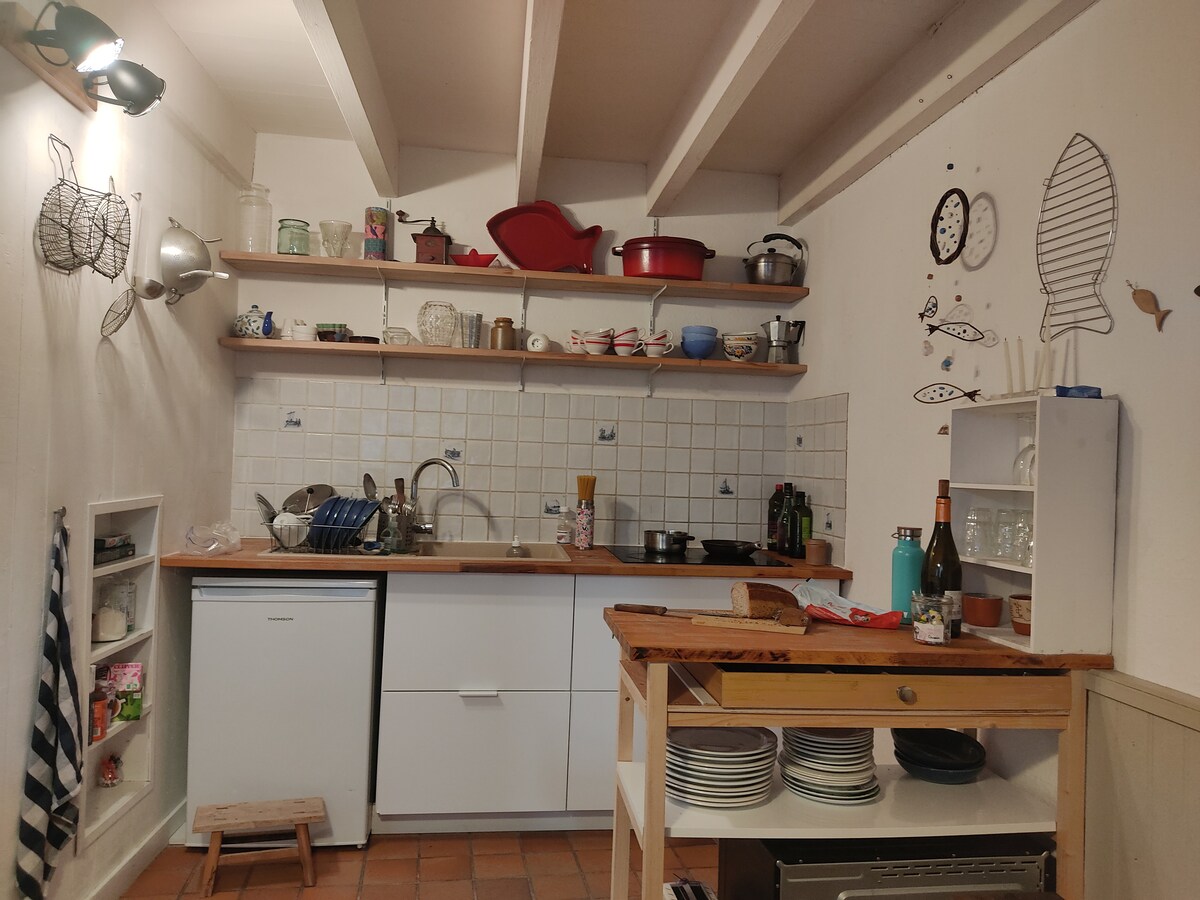 En la plaza del pueblo de St-Suliac, uno de los pueblos más bonitos de Francia, un nido para sus vacaciones o estancias creativas. Justo enfrente de la tienda de comestibles, a pocos metros de la panadería, el mercado de pulgas, la oficina de turismo, la iglesia, la playa y los cafés-restaurantes. ¡Muy céntrico! Es el estudio de artista de Virginie Bregeon que viste cada pieza de objetos buscados con los colores de Bretaña e invita a grandes artistas bretones (Mathurin Méheut, Henri Rivière) en las paredes...