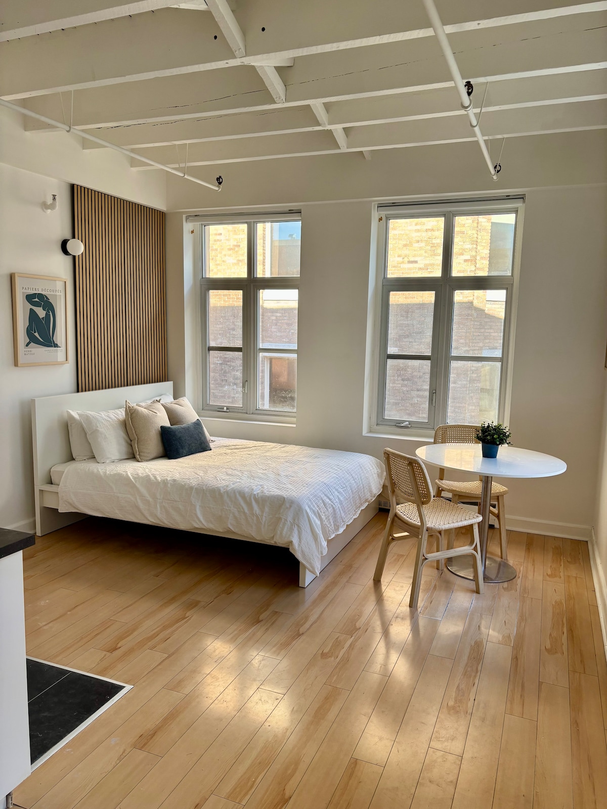 Alójate en un loft privado en un penthouse con terraza en la azotea, vistas arquitectónicas desde la azotea y estacionamiento subterráneo gratuito, justo en el corazón del casco antiguo de Quebec. Incluye lavadora/secadora en la unidad, wifi rápido, Nespresso, bañera con patas y un techo de catedral con vigas del siglo XIX. Pasos a Château Frontenac, cafés y calles empedradas. El encanto histórico se encuentra con la comodidad moderna.
