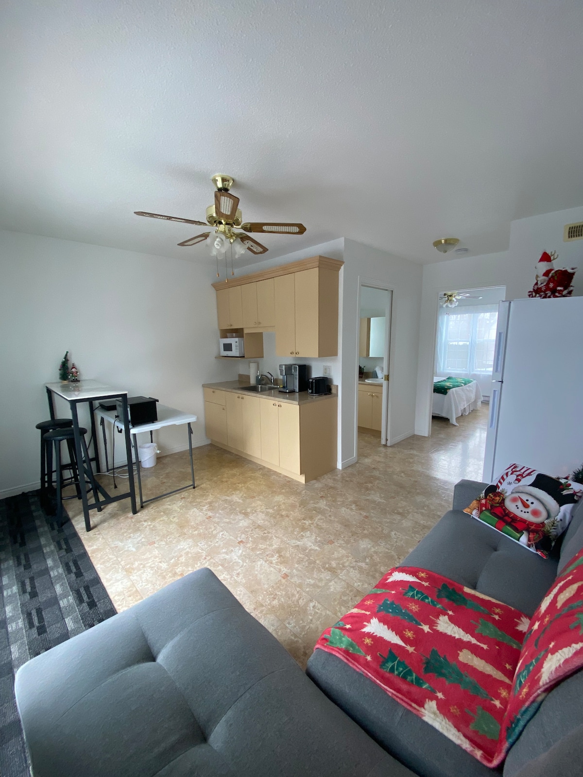 Bienvenue dans mon logement! Pour vous accueillir, je vous offre : -1 lit double dans la chambre + 1 divan-lit au salon. -Cuisinette équipée d'un réfrigérateur/congélateur, plaque chauffante, micro-onde, grille-pain, cafetière. -Salle de bain privée. -Café, thé et chocolat chaud gratuit -Wi-Fi gratuit -Laveuse/sécheuse gratuite -Stationnement extérieur gratuit ** Résidence familiale dans la partie principale de la maison **