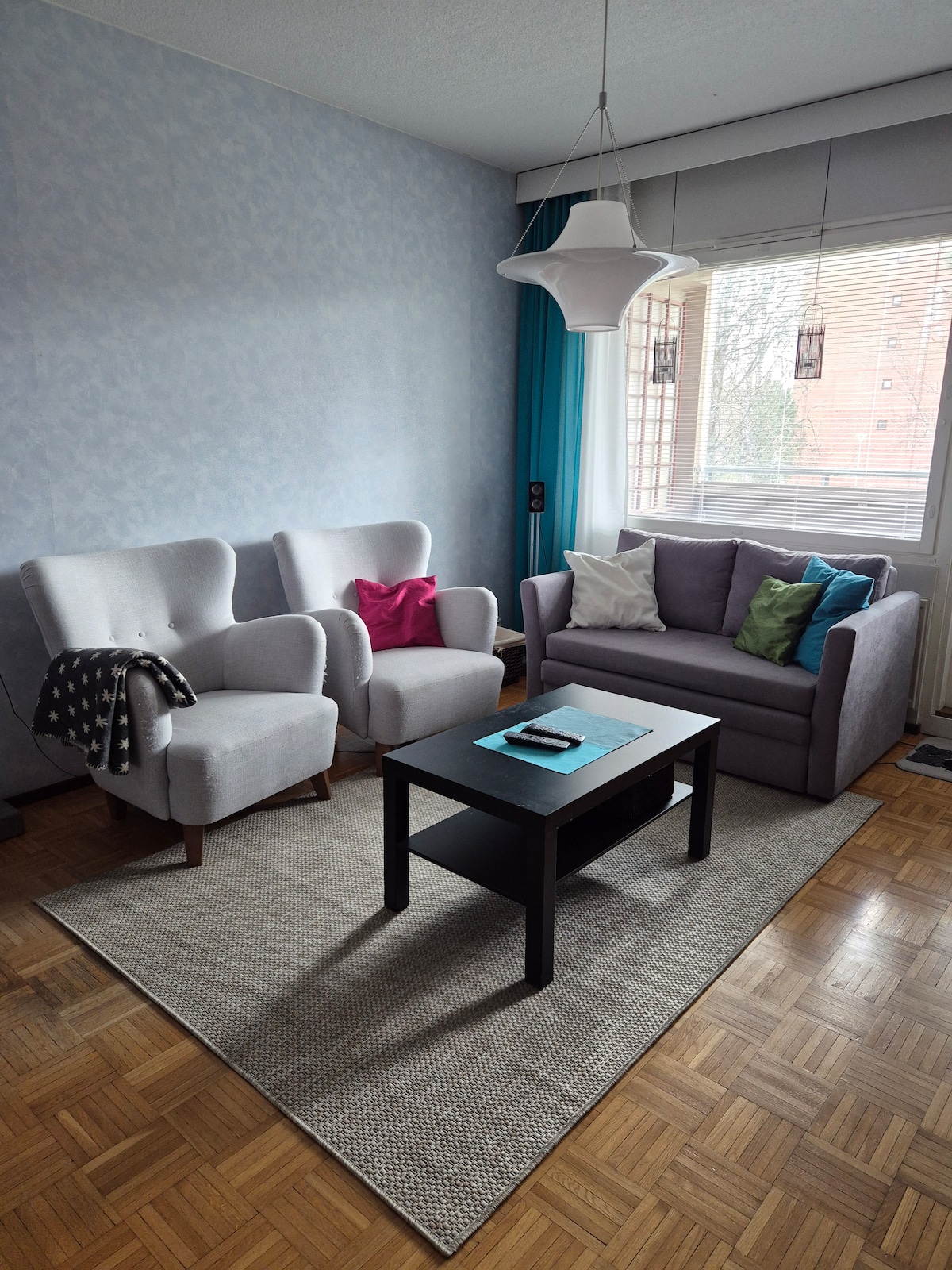 Un nuevo y luminoso apartamento de dos habitaciones con buen gusto, justo al lado del centro comercial Puuvilla. La ubicación del apartamento es muy céntrica, pero aún sin ruido de tráfico. Centro de la ciudad a 1 km, a Kirjurinluoto 900 m. El apartamento cuenta con todos los electrodomésticos que necesitas, así como una lavadora que seca. Cama doble y sofá cama doble. Si es necesario, también hay una cama de repuesto para una persona. Apartamento con TV de 55 pulgadas, radio y wifi/fibra óptica. Acogedor patio con muebles de exterior y un lugar de estacionamiento en el patio.