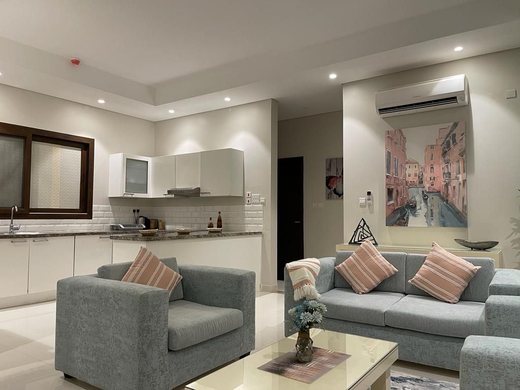 Apartamento de lujo con total privacidad y hermosas vistas a las plantaciones de narguil de Dhofar. Nuestro apartamento de lujo es tranquilo y elegante, y es un apartamento espacioso para familias pequeñas. Además, los huéspedes pueden utilizar todas las instalaciones del hotel, como la piscina, el gimnasio, la pista de tenis, el spa, la peluquería, los restaurantes y las cafeterías, a precios simbólicos y reducidos. Nuestro apartamento de lujo está situado en la zona de Al Saada, a unos 5 minutos en coche de la playa de Daharis y a unos 4 minutos en coche y 15 minutos a pie del centro comercial Grand Mall.