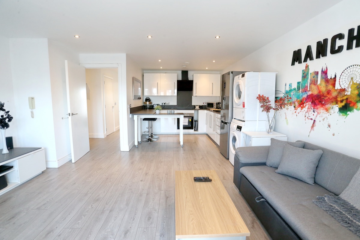 Amplio apartamento de lujo con aparcamiento. - Apartamento en planta alta con «balcón grande». - Llegada autónoma inteligente «llegada en cualquier momento». - Aparcamiento gratuito. - Tranvía y transporte público al otro lado de la carretera. - A pocos pasos de Media City, Lowry, el estadio del Manchester United, cafeterías y restaurantes. - A minutos del centro de la ciudad en transporte público. - Servicio de limpieza de hotel de 5 estrellas. - Ropa de cama cómoda y de alta calidad. - Wifi de alta velocidad ilimitado. Todo lo que necesitas para una estancia de calidad en Mánchester.
