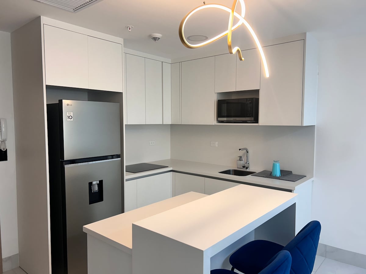 Si buscas un espacio que combine la comodidad de un hogar con la estética de una revista, has llegado al lugar correcto. Este departamento de 2 habitaciones es el escape perfecto para viajes de negocios, parejas o familias pequeñas que desean disfrutar de una estancia ultra moderna y excepcionalmente equipada. Ingreso por medio de cerradura inteligente. Habitaciones con camas tipo full. Baño completo. Sala-comedor amplia, Smart TV de 50”. (Netflix - Youtube) Internet (wifi de alta velocidad)
