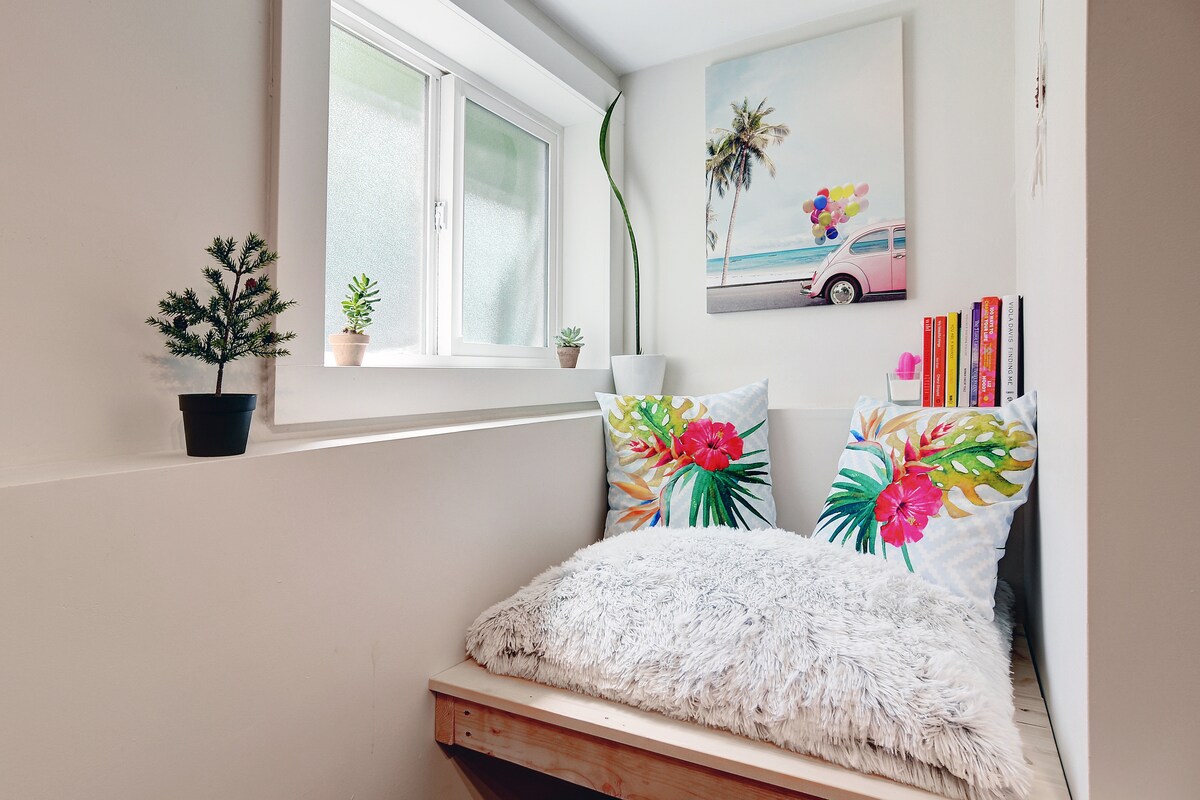Te damos la bienvenida a nuestra acogedora suite privada de más de 1000 pies cuadrados y un dormitorio. Perfecto para trabajo o estancias largas: sala de estar y comedor, escritorios, wifi rápido y confiable de 643 Mbps, televisor inteligente LG de 55 pulgadas, chimenea de gas, sofá cama, segundo sofá, terraza cubierta, patio privado cercado con vista parcial al mar. Amplio dormitorio con una cama tamaño queen y una cama doble, baño completo/ducha. Estacionamiento gratuito, lavadora/secadora en la suite, 2 bicicletas eléctricas para usar. Se admiten mascotas: se prefieren perros pequeños y medianos de buen comportamiento. Prov. n.° H152939652 Licencia municipal n.° 0010785