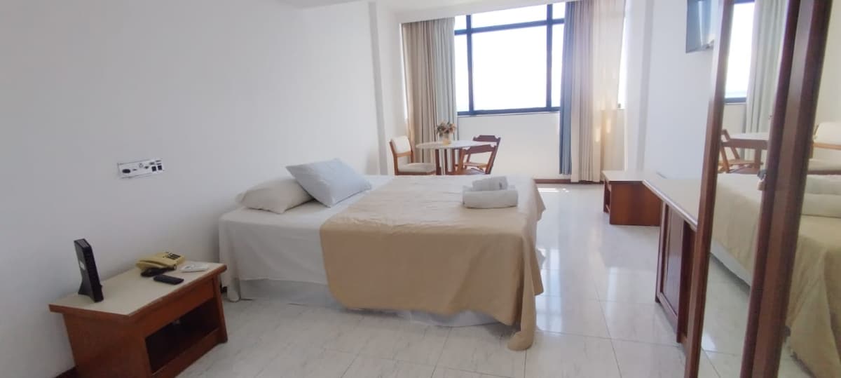 Habitación ideal para São João y el amor. Suite con capacidad para alojar cómodamente hasta dos personas, con una cama doble, aire acondicionado, minibar, baño privado, con ducha de agua caliente, Wi-Fi, ropa de cama y baño. Ideal para una persona o pareja, con el objetivo de alojarse por períodos de dos o más días en la ciudad con comodidad, conveniencia y economía. Nota: No se permite fumar.