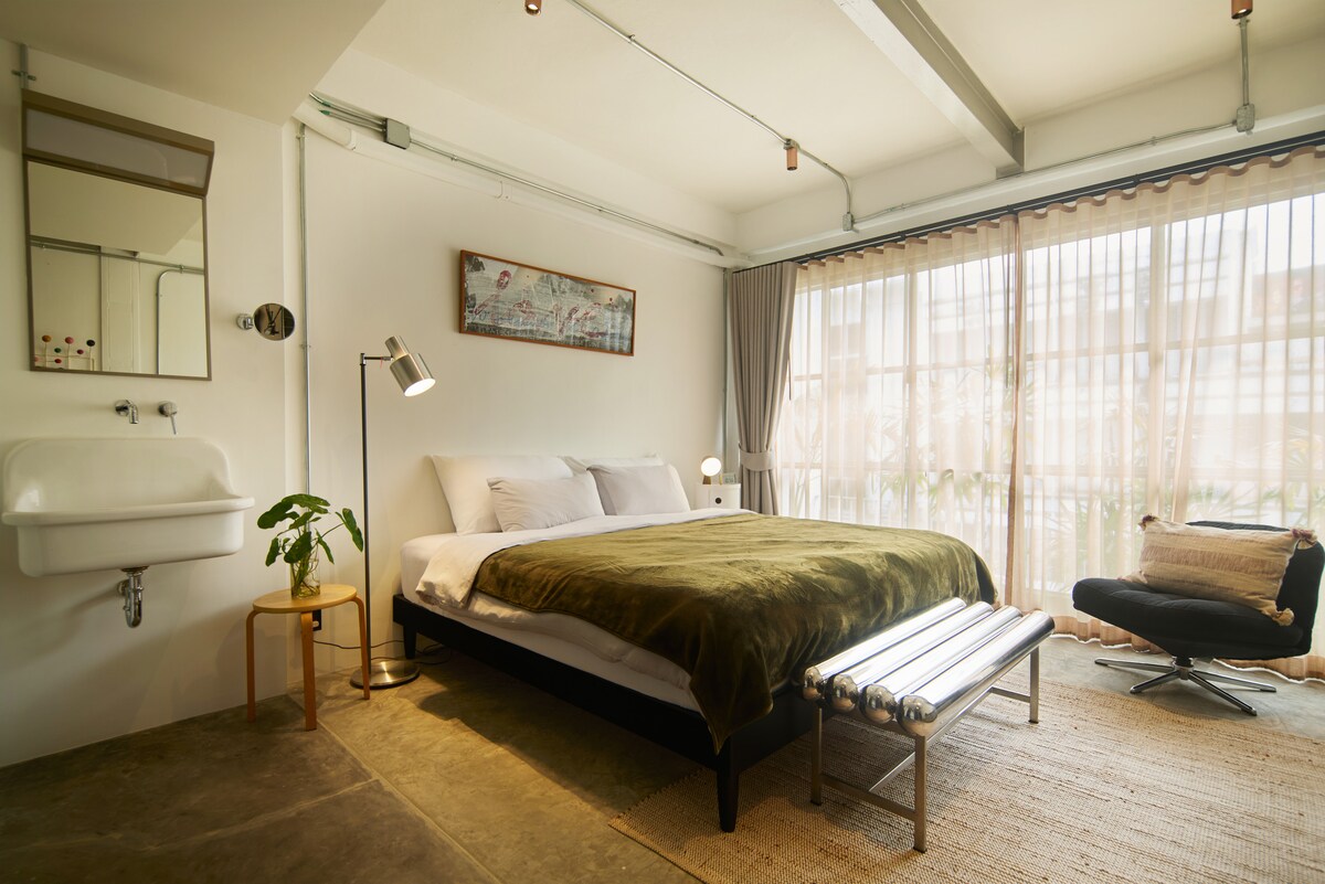 La habitación privada está diseñada en un estilo minimalista cálido y acogedor inspirado en la ciudad de Paknam. La habitación cuenta con una minicocina con microondas. Un balcón con un fregadero ofrece vistas a la ciudad y al monorraíl, mientras que la sala de estar y el comedor cuentan con un balcón de vidrio de 3 metros de largo que baña la habitación con luz natural. Los huéspedes pueden trabajar, cenar y relajarse en un cómodo rincón de la habitación, y hay wifi de alta velocidad disponible en todas partes.