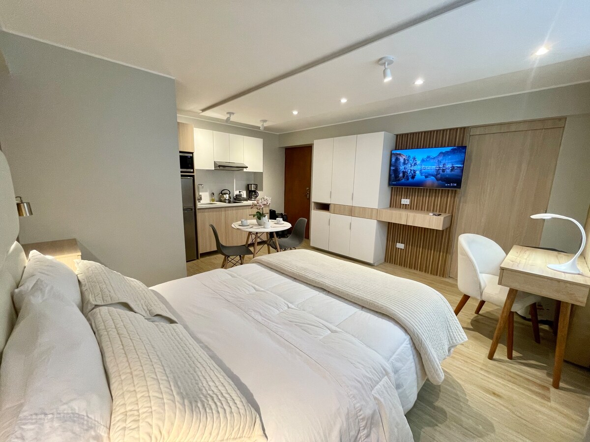 Nuestro Loft tiene un estilo minimalista está en una ubicación segura y estratégica cerca al Ctro. Financiero San Isidro. A pasos de la Estación Aramburú del Metropolitano. Cuenta con baño completo privado, kitchenette y zona de trabajo. Te encantarán sus almohadas viscoelásticas y su colchón, donde no querrás despegarte, muy confortable para un descanso placentero en la ciudad. Posee ventanas termoacústicas y cortinas blackout ¡Lo mejor es que está cerca a todo lo que te imaginas !