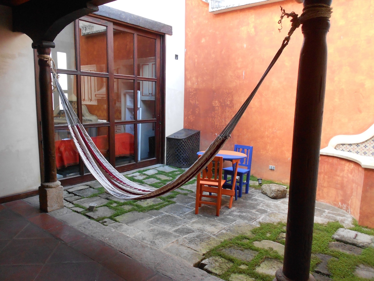 A Hidden Oasis 4 blocks from the Central Park. There's no place like this in Antigua. You may not want to leave! Sleeps 3. Fully equipped & comes with 1 secure parking space & very large TV screen. Best WiFi in Antigua. You'll be living in a lush & expansive garden with a view of the Volcano Agua that can't be beat. 7 other Casitas share this beautiful setting..