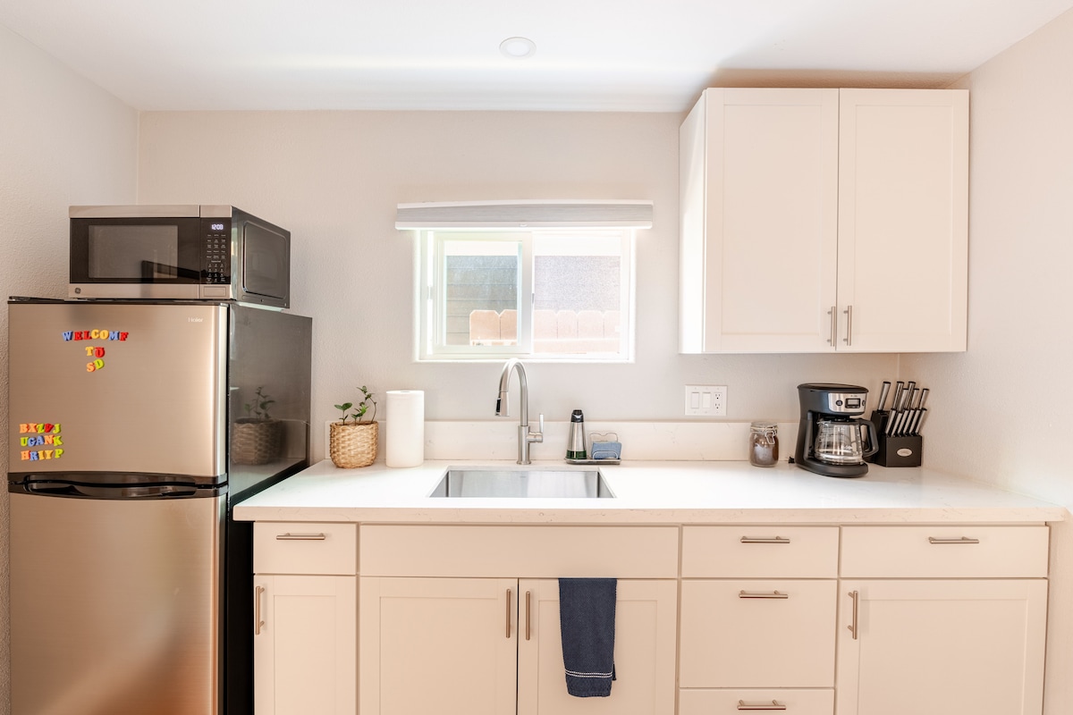 ¡Disfruta de esta tranquila casa de huéspedes nueva de dos pisos con vistas a las copas de los árboles! Un día perfecto podría ser un paseo matutino por el parque Balboa, el centro cultural de San Diego, rodeado de 58 millas de senderos para caminar y correr, seguido de un corto paseo a los bares y restaurantes súper divertidos de Hillcrest, North Park y University Heights. ¡Nos ENCANTA este barrio y estamos encantados de compartir su belleza, cultura y ambiente acogedor con nuestros huéspedes!