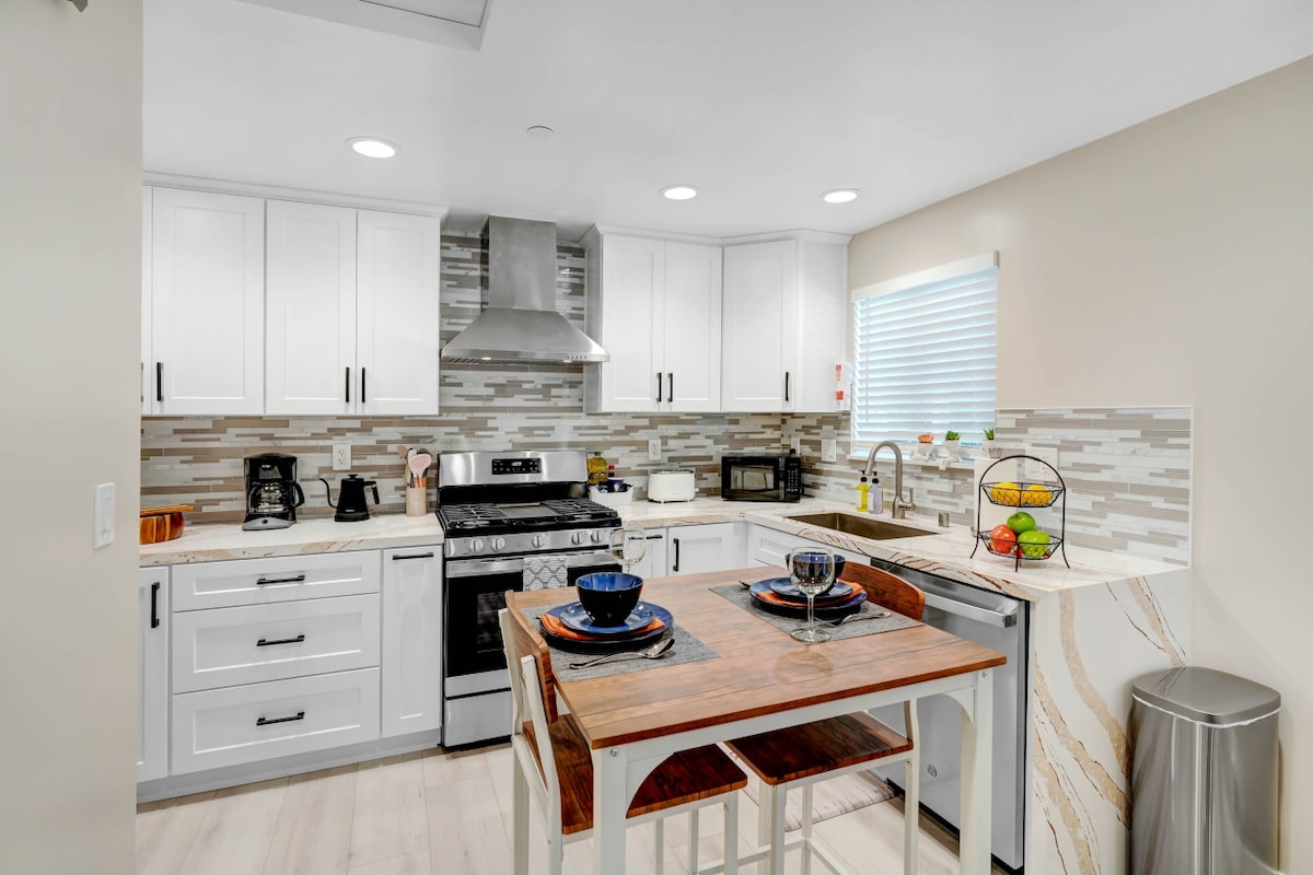Disfruta de nuestra casa de huéspedes totalmente remodelada, amueblada, moderna, tranquila y privada en el corazón del condado de Los Ángeles. Despiértate cada mañana con el suave coro de pájaros del club de campo saludando el nuevo día Disfruta de un hermoso sol en nuestro patio trasero o tómate de 5 a 10 minutos para caminar hasta los supermercados, restaurantes y parques. Conduce para explorar el centro de Los Ángeles y Hollywood en 30 minutos Toda la unidad es de 500 pies cuadrados, cocina y baño totalmente equipados, Internet de alta velocidad, TV inteligente, lavadora/secadora gratuita