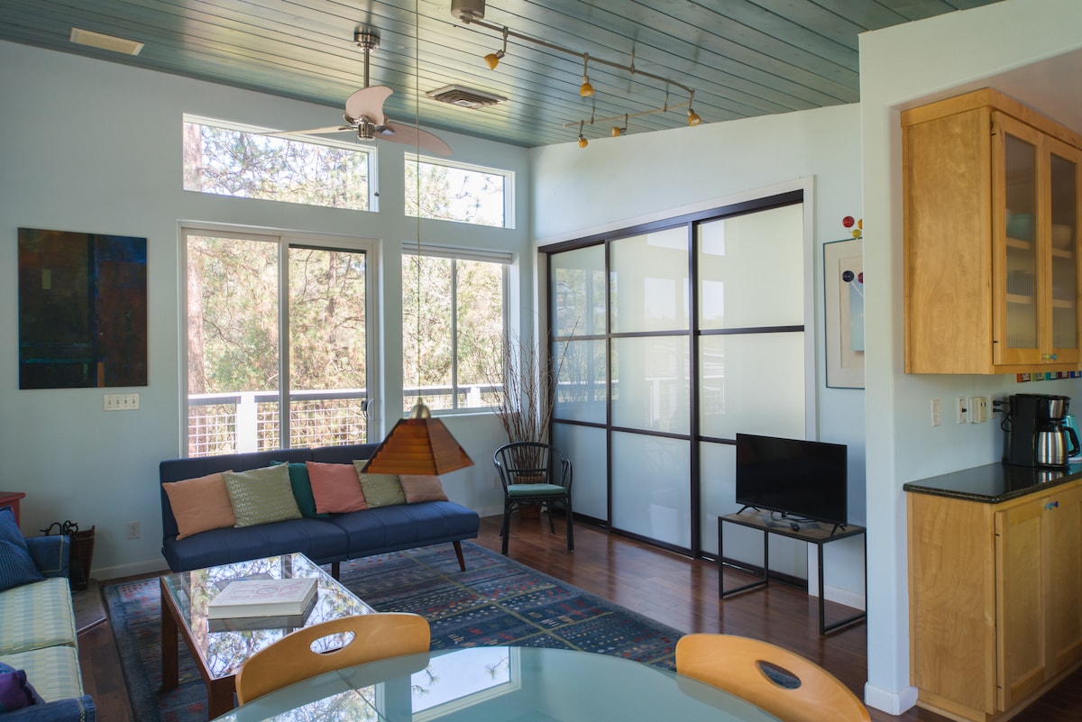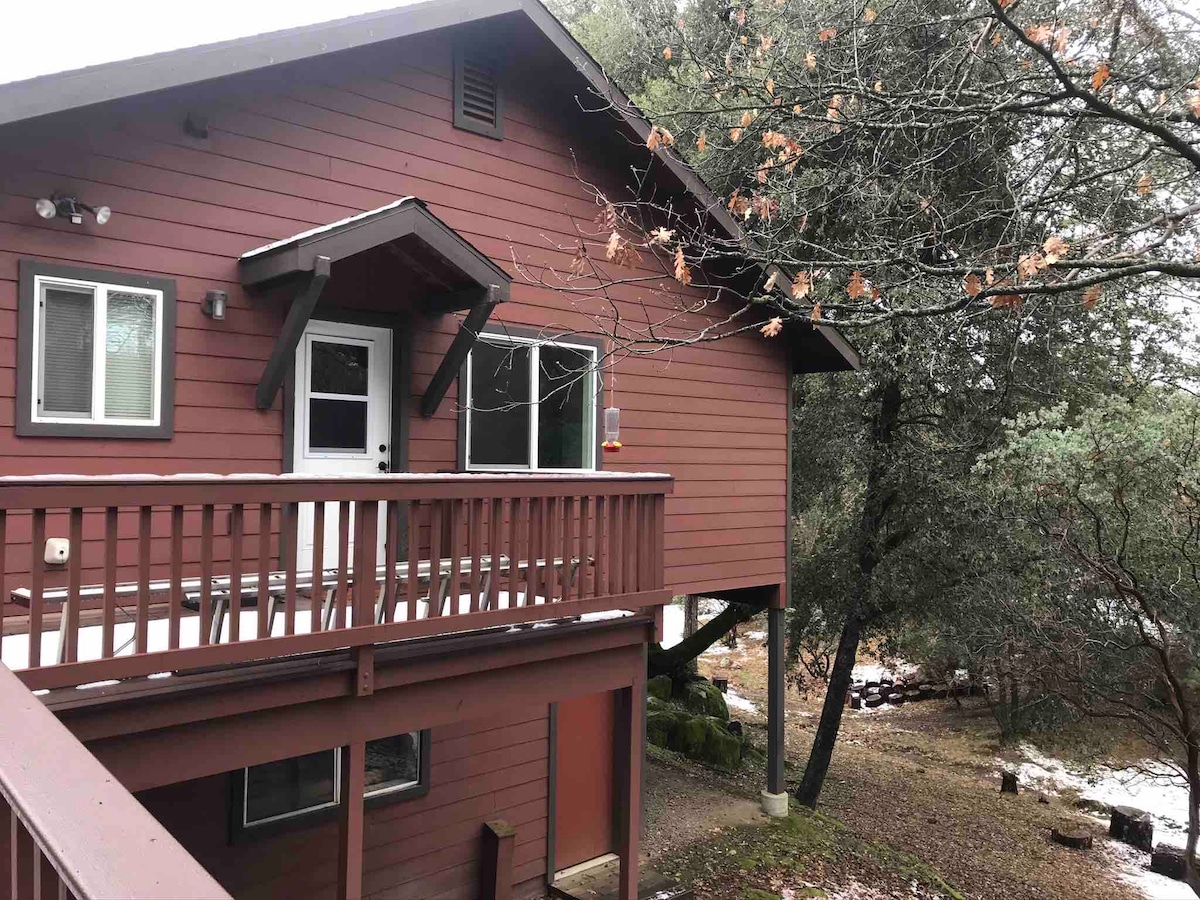 Shambala - "place of peace and tranquility" - a jewel in the Sierra Foothills on seven acres of magnificent oaks and pines. This one-bedroom cottage sleeps four -- queen bed in the bedroom, comfortable queen sofabed and futon in the living room, full kitchen, smart TV, Wi-Fi, work desk, big windows looking out onto the woods, wraparound deck for lovely outdoor dining. A magical retreat - wildflowers in the spring, a seasonal creek, a dusting of snow in winter - Shambala is your Yosemite secret.