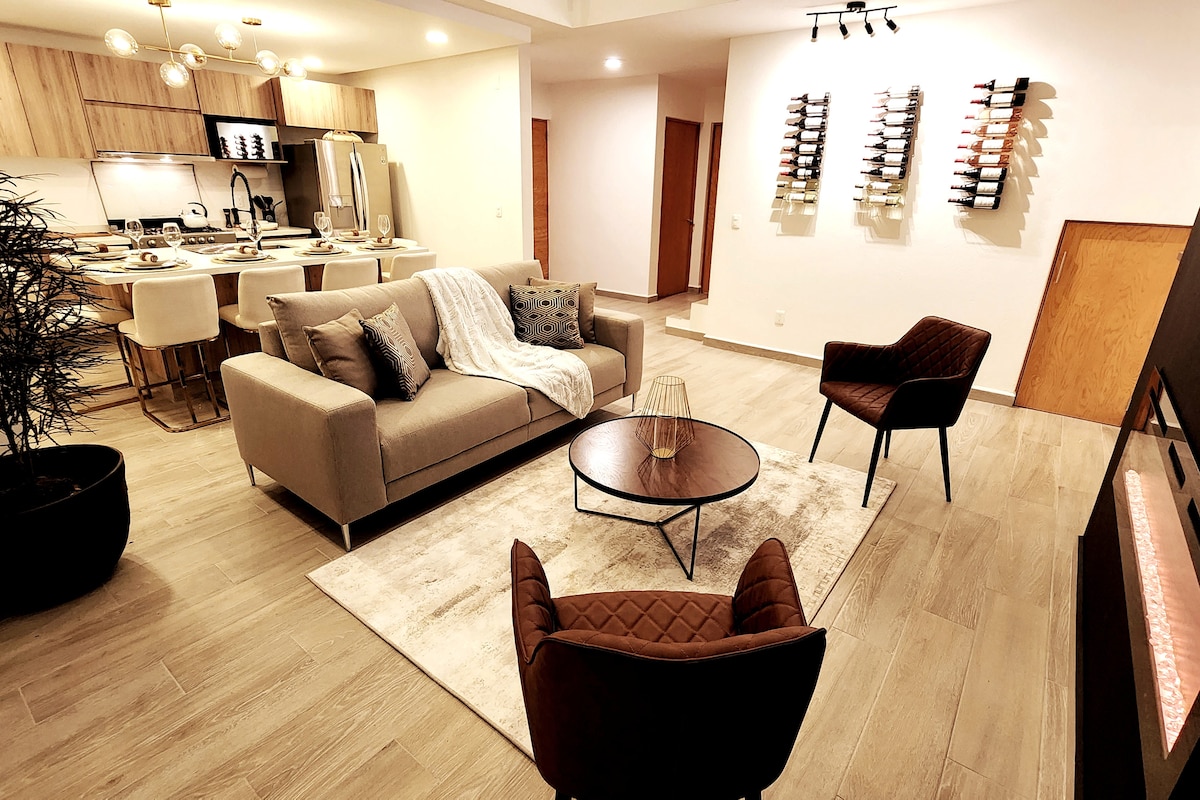 Amplio departamento nuevo de 160 m2, ubicado en el corazón de Juriquilla ofrece una experiencia única, con increible tecnologia, iluminacion, amenidades y entretenimiento. Si busca lo mejor, no busque más y venga al departamento más moderno y lujoso de Querétaro para una estancia inolvidable Caminando del Starbucks, Walmart, bares y los mejores restaurantes como Sonora Grill & Hunger, este departamento lo tiene todo, camas cómodas, amplio balcón, TVs 4K OLED y Home-Cinema de 100" desde su cama