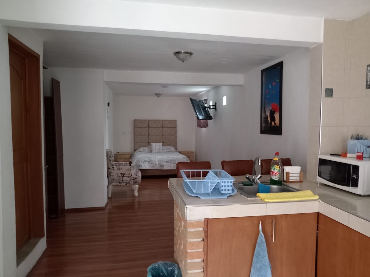 Este lugar único tiene su propio estilo. excelente ubicación, amenidades como despachador d jabón líquido, wifi 24 horas, agua caliente, 2 aguas d cortesía, refrigerador nuevo, cocineta con gas para preparar alimentos, papel higiénico y servilletas; trastes, horno d microondas, lavadero disponible y no compartido