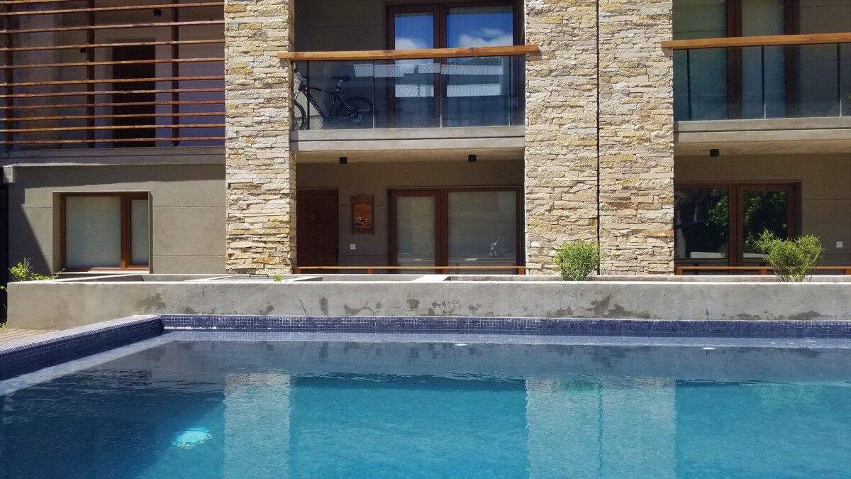 Hermoso y luminoso departamento en pleno centro Super comodo, con parrilla propia, pileta climatizada descubierta, quincho, gimnasio y sauna Se encuentra en una zona estrategica por su cercania con la plaza Sarmiento, a pocos meros del mejor circuito gastronomico y comercial de nuestra aldea de montaña, y a la vez, un entorno muy residencial donde descansar de ruidos y con vistas amplias desde sus amplios ventanales. Comercios practicos a pocos metros