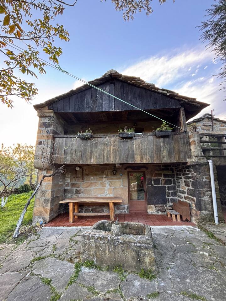 Ideal tanto para parejas como familias , construida en piedra y tejado de lastra original, inigualable localización y vistas, Bosque Privativo de Robles y Castaños con mesa de picnic propia, extensa finca para pasear en un entorno espectacular,2 plantas,3 habitaciones una de ellas con sofá y tv, Barbacoa - Chimenea exterior , Pozo de agua , Porche cubierto , Balconada, Mirador - terraza colgado en la ladera con increíbles vistas al valle y las montañas,igual que toda la casa,un lujo de postal !