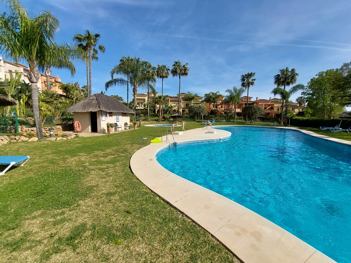 Encantadora casa en Bel Air Estepona. A poca distancia a pie de la playa y a 5 minutos de Puerto Banús, a 4 minutos de San Pedro, a 10 minutos de Estepona y Marbella. 2 dormitorios en suite, cada uno con su baño. Encantador jardín para relajarse en el jacuzzi. Muy bonito jardín comunitario con 2 piscinas seguras. Totalmente equipado: lavadora, secadora, lavavajillas, 2 televisores inteligentes, sistema de sonido Sonos, wifi, etc. 4 campos de golf a menos de 5 minutos en coche. (Atalaya Golf, El Paraíso, Los Flamingos, Guadalmina)
