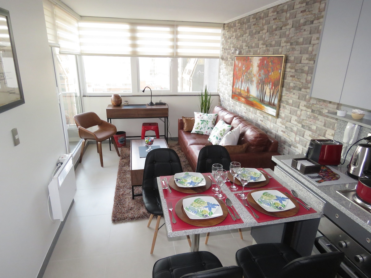 Disfruta de una experiencia con estilo en este alojamiento céntrico, cómodo y full equipado: - Ideal para 2personas - 1 cama queen + 1 futón - Wifi, SmartTV+3000canales(fútbol incluido)Netflix - Cocina full equipada. El edificio ofrece gimnasio y sala de cowork. A 3min del terminal, estadio, universidades, lavandería, farmacias y supermercados. Con locomoción a la puerta, conectividad ideal. Cuenta con conserjería 24/7. Perfecto para descansar, trabajar o explorar la ciudad.