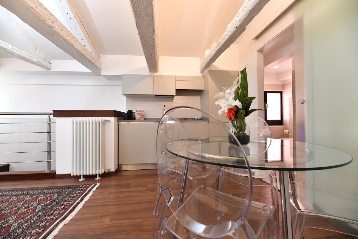 El suelo de madera con calefacción y la sala de estar con vigas a la vista hacen que el alojamiento sea muy acogedor. La terraza en la planta te permitirá almorzar y cenar al aire libre entre los tejados de Venecia. Lancha Alilaguna AEROPUERTO - S. STAE (punto de encuentro). S. STAE es la parada n.º 5 en el Gran Canal. A tu llegada, se debe pagar el impuesto turístico municipal equivalente a: 4,00 € por persona y noche de estancia; 2,00 € para jóvenes de entre 10 y 16 años (no cumplidos)