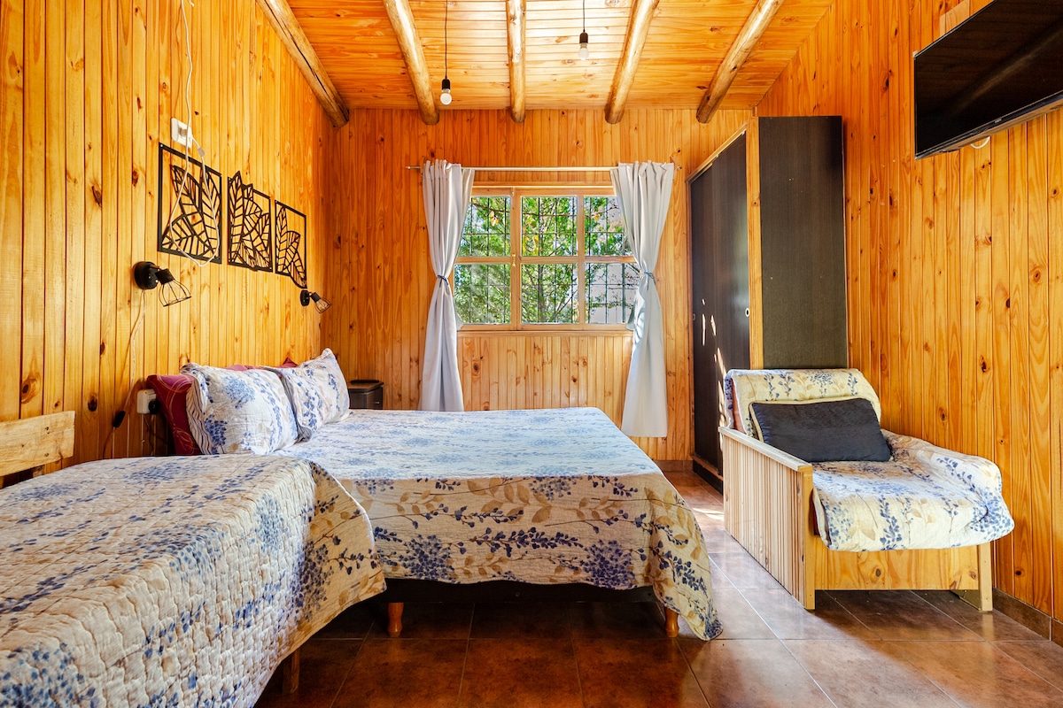 Viví un fin de semana d pura desconexión rodeado de naturaleza, a pasos del Río Atuel, a 30 minutos del centro de San Rafael, esta cabaña es el refugio ideal para descansar, respirar aire puro y disfrutar de una escapada romántica o en familia. Cuenta con: 🌿 Aire acondicionado frío/calor 🥐 Desayuno desde $3500 extra 🛏 4 camas (una doble + dos individuales) 📺 TV y mesa de comedor 🚗 Cochera con tela antigranizo Ubicada sobre la ruta 179 , al reservar envío la ubi exacta.