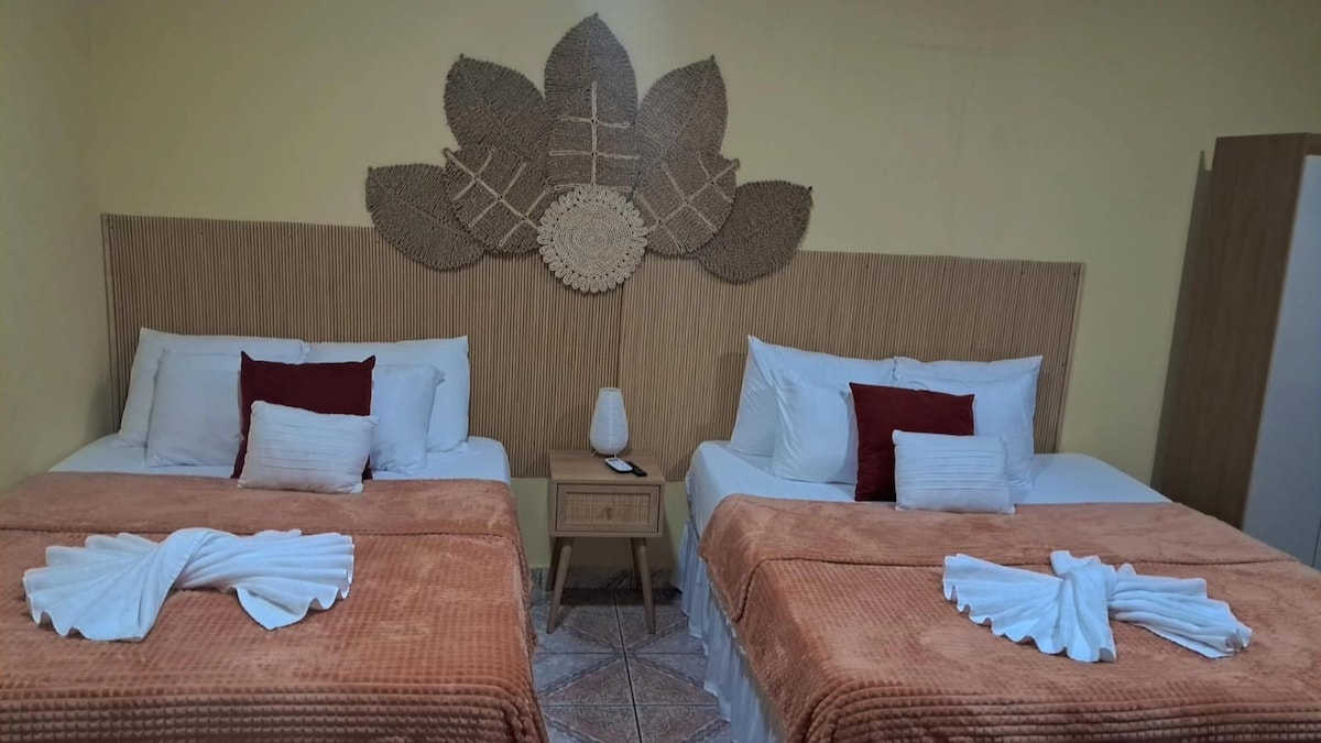 Disfruta tu estadia con toda la familia en este alojamiento donde la tranquilidad se respira. Comodo, confortable y seguro que te hara sentir como en casa. Cuenta con 2 habitaciones con a/ac, 1 baño, sala con a/ac, tv, wifi, comedor, cocina y patio donde podras descansar rodeado de la naturaleza y disfrutar de un rico asado. Podras relajarte en un dia de paseo por el parque o de un dia de piscina, o si prefieres conocer la ciudad con centros comerciales y restaurantes muy cerca.