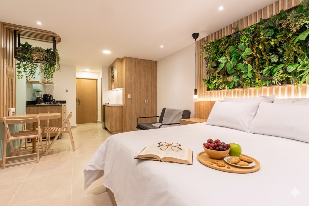 Cuidadosamente decorado con una decoración relajante y una iluminación ambiental suave, este elegante apartamento ofrece un ambiente lujoso pero acogedor desde el momento en que llegas. El penthouse cuenta con 2 amplios dormitorios con camas tamaño queen, además de un cómodo sofá cama en la sala de estar, lo que lo hace ideal para parejas, amigos o familias pequeñas. Cada espacio es luminoso, espacioso y está diseñado para ayudarte a relajarte. Disfruta de una cocina totalmente equipada, perfecta para cocinar en casa durante tu estancia. La mejor ubicación de la ciudad