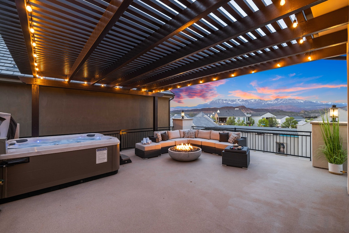 Alojamiento de lujo ubicado cerca de Zions, Snow Canyon y Sand Hollow. Cuenta con 4 dormitorios, 3,5 baños y capacidad para 20 huéspedes, incluida una habitación con literas de 9 camas. ¡Nos enorgullecemos de nuestras camas cómodas! Equipado para preparar comidas caseras y asar a la parrilla junto a la piscina. Ve una película desde la piscina privada y disfruta de una experiencia interior/exterior. A los niños les encantarán las canchas de ping-pong, skeeball y pickleball, así como las piscinas comunitarias. Relájate junto a nuestra chimenea en la azotea y asa malvaviscos. ¡Una experiencia vacacional que siempre recordarás!