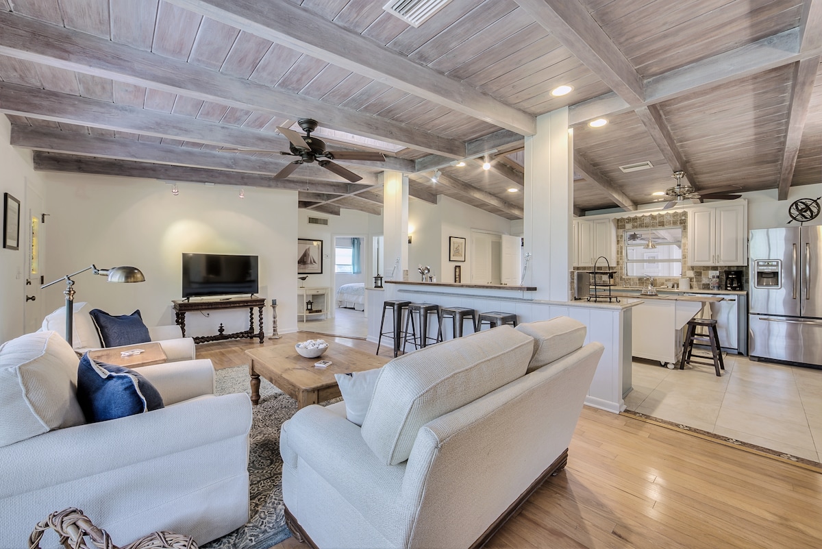 Ubicado a menos de una milla de la playa en el centro de la ciudad, Open Spaces y Bright Beachy Vibes te recuerdan suavemente por qué viniste. Las puertas francesas en ambos dormitorios se abren a un hermoso Lanai apantallado con comedor al aire libre y barbacoa con vistas a una pequeña "playa". El dormitorio principal tiene una cama tamaño king con baño privado con ducha; el dormitorio adicional para invitados tiene 2 camas individuales o una cama tamaño king y un baño para invitados en el pasillo. Esta casa de campo completamente renovada comparte 1,62 acres con una casa adyacente y fue diseñada para una privacidad absoluta.