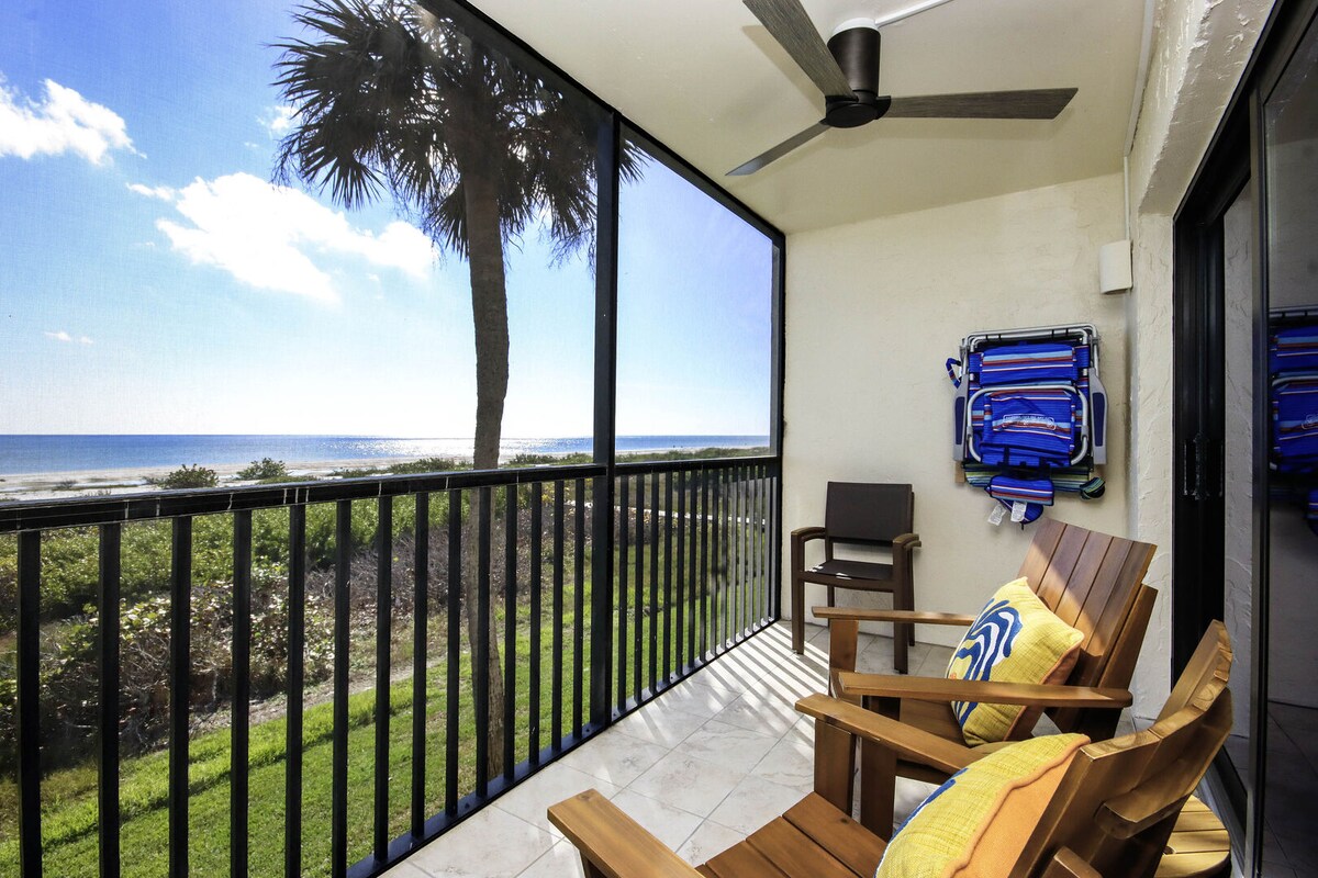 ¡Somos Superanfitriones por una buena razón! ¡La siesta de Sanibel se ve increíble! Inmaculada frente a la playa, 2BR, 2BA con garaje, unidad de playa muy bien actualizada en el borde de la arena. ¡Vistas increíbles del Golfo con calificaciones de 5 estrellas! Mínimo de 3 días. ¡nuevas ventanas DE huracanes, recién pintadas con ASCENSOR EN EL EDIFICIO! Descuento para alquileres semanales/meses. BR 1: cama king, en la habitación, TV inteligente. BR 2: 2 camas individuales, TV inteligente. Sofá cama Qn. en LR. Piscina, campo de golf, bicicletas, lavandería en el lugar. No hay alimentos ni condimentos almacenados en la unidad. Puede permitir perros pequeños.