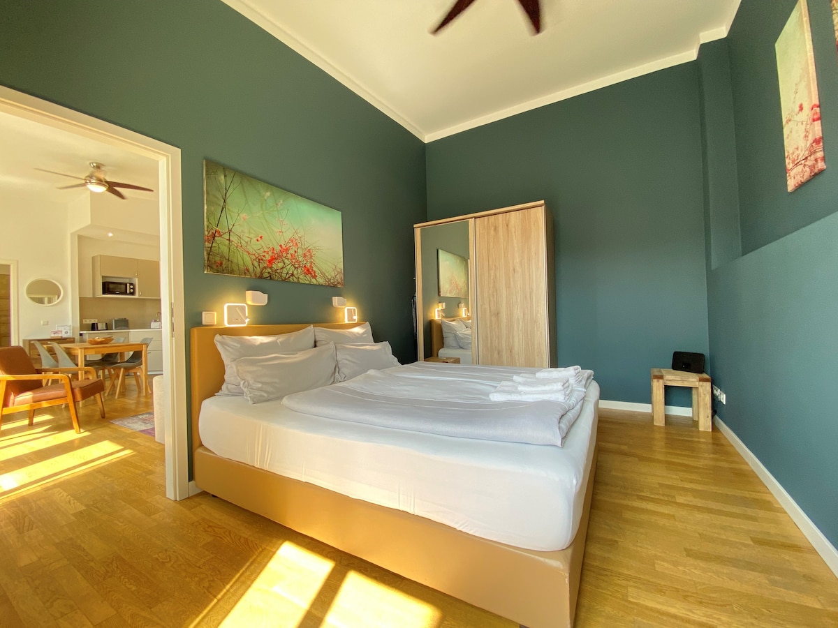 ¡Qué ubicación! ¡Justo al lado del Parque Sanssouci! El apartamento está situado justo donde la ciudad y la naturaleza se unen: edificios históricos, un ambiente relajado y sin embargo aislado: disfrute del "Parque Sanssouci" justo en la puerta de su casa (a unos 300 m a pie). El acogedor centro de la ciudad con las idílicas calles y cafés del parque, así como las tiendas, se encuentra a unos cinco minutos a pie, a través del casco antiguo histórico.