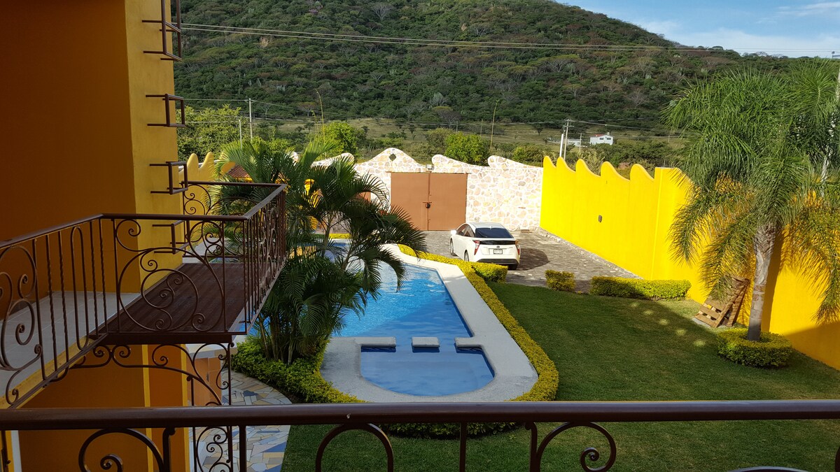 Relájate con toda la familia en este alojamiento donde la tranquilidad se respira, es un espacio cómodo ideal para personas o familia que va de paso a otros Estados, se ubica a 10 mn a la pista siglo 21, a 25 mn a la pista de la CD Mex. a 25 minutos de Yecapixtla, a 25 mn de la zona arqueológica de chalcatzingo, enfrente se ubica el clud de golf paraíso tlahuica, a 15 minutos del parque industrial de Cuautla, a 15 MN de finca Guadalupe, 25 MN a plaza atrios, 20 MN a Cuautla, jardín amplio.
