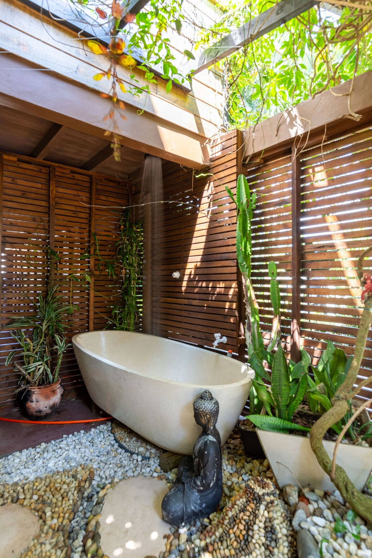 ATENCIÓN: Bungalow romántico con entrada privada a través del bosque, vista panorámica de una de las playas más hermosas de Brasil, Praia do Forte, junto a Jurere Internacional, estacionamiento privado. El bungalow tiene minibar, microondas, cafetera y fregadero. Aquí tendrás privacidad, paz y seguridad durante tu estadía. A 120 m de Praia do Forte y a 400 m de Jurere.