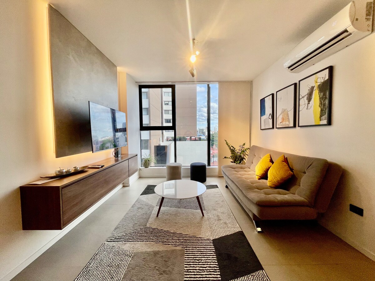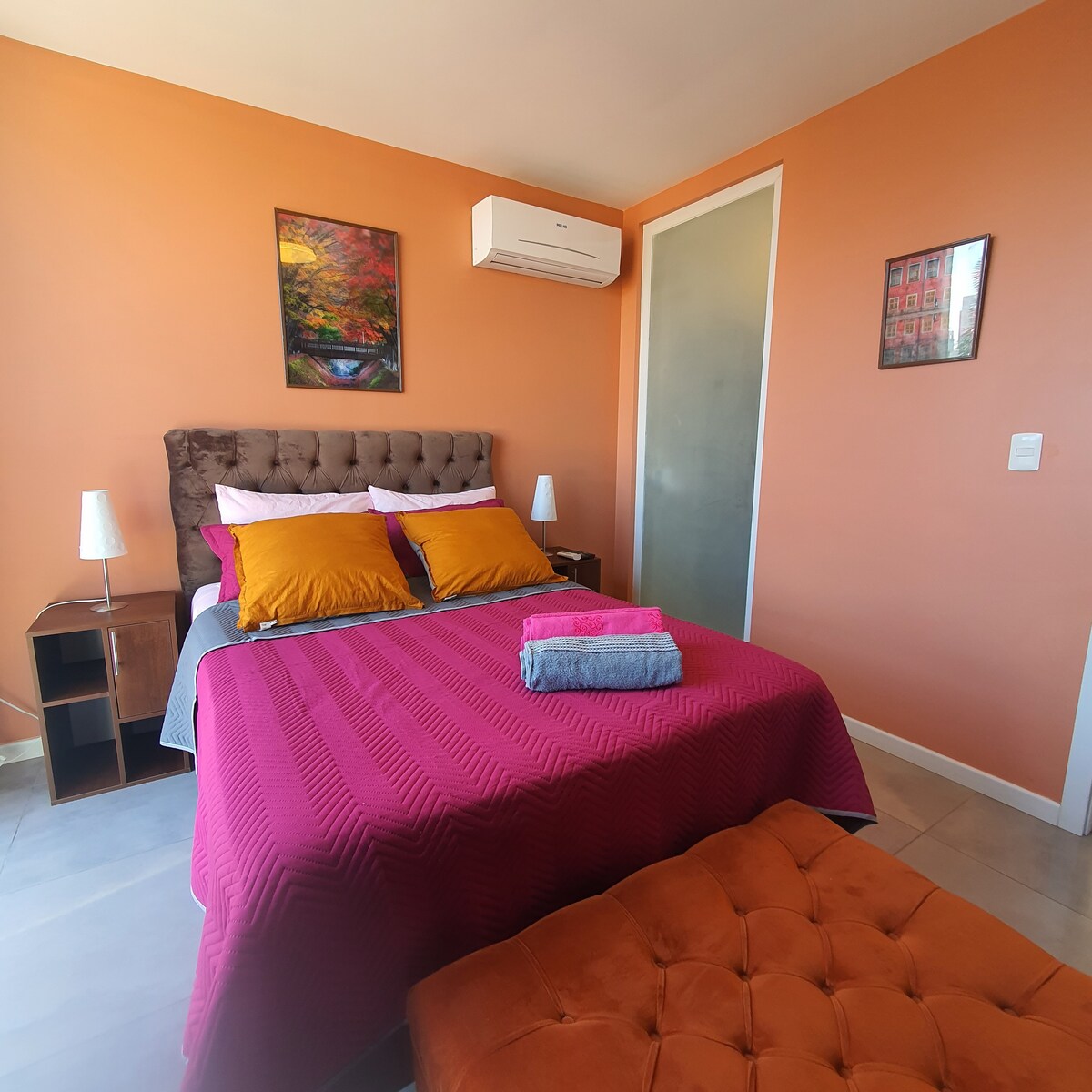 Descubre la elegancia en este acogedor departamento de 1 habitación con vistas de ensueño. Experimenta el lujo de un equipamiento extremo con una Smart Tv de 65" 4K HDR en sala y otra Tv 50" en dormitorio, potentes equipos de aire acondicionado, lavadora, y electrodomésticos necesarios, cama Queen Ultra Confort, cambiador y tocador, además de la domótica y Alexa para cumplir tus ordenes. Viví la síntesis de la modernidad como nunca antes, reserva YA!