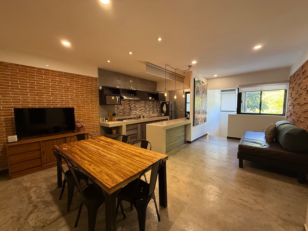 Increíble departamento de un solo piso, estilo étnico contemporáneo, piezas artesanales complementan su original decoración. Diseñado para ofrecer a sus huéspedes una estancia cómoda, funcional y acogedora. Tiene todo lo necesario para hacerte sentir como en casa, con dos encantadoras habitaciones equipadas con camas queen size, sala comedor, baño, cocina equipada y un amplio estacionamiento. Ubicado en un barrio muy tranquilo, a 10 minutos en taxi del centro de la ciudad o 40 minutos caminando.