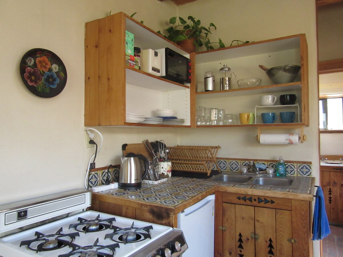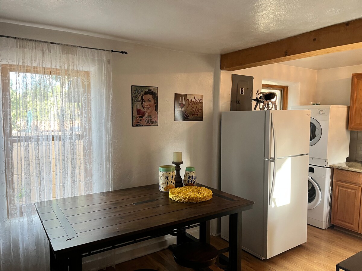 Mi casa está a 1,2 millas de la plaza en un barrio residencial convenientemente ubicado. Con su estilo pequeño y sencillo de Santa Fe, ¡te sentirás como en casa de inmediato! La habitación principal tiene una chimenea kiva y un sofá cama, así como una cocina completa y una pequeña zona de comedor. Hay un dormitorio separado con armario y lavadora/secadora. El patio privado cerrado es perfecto para niños y mascotas. Esta casa de huéspedes está separada, pero al lado de mi casa donde vivo con mi pareja, nuestro hijo y perros peludos.
